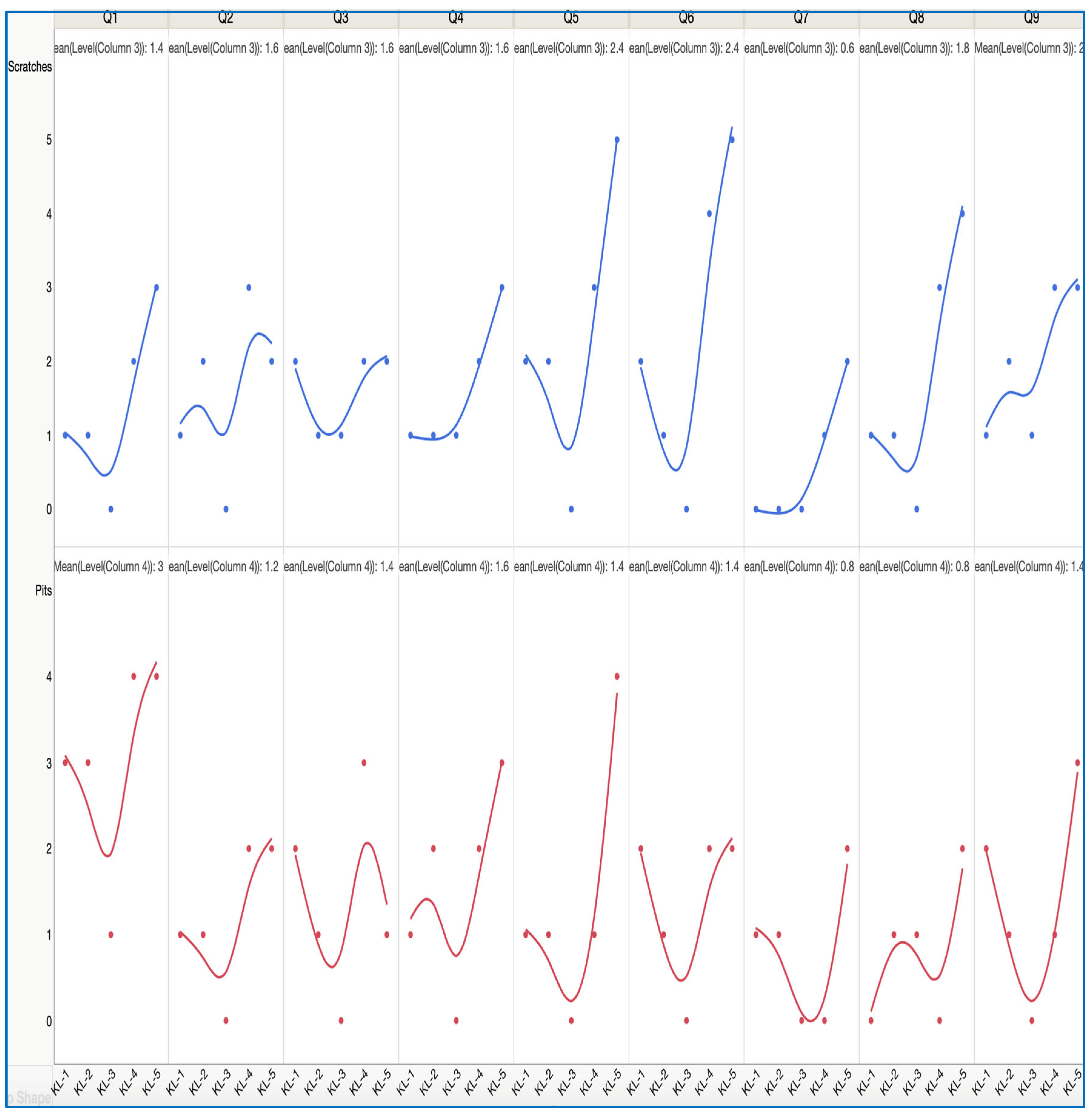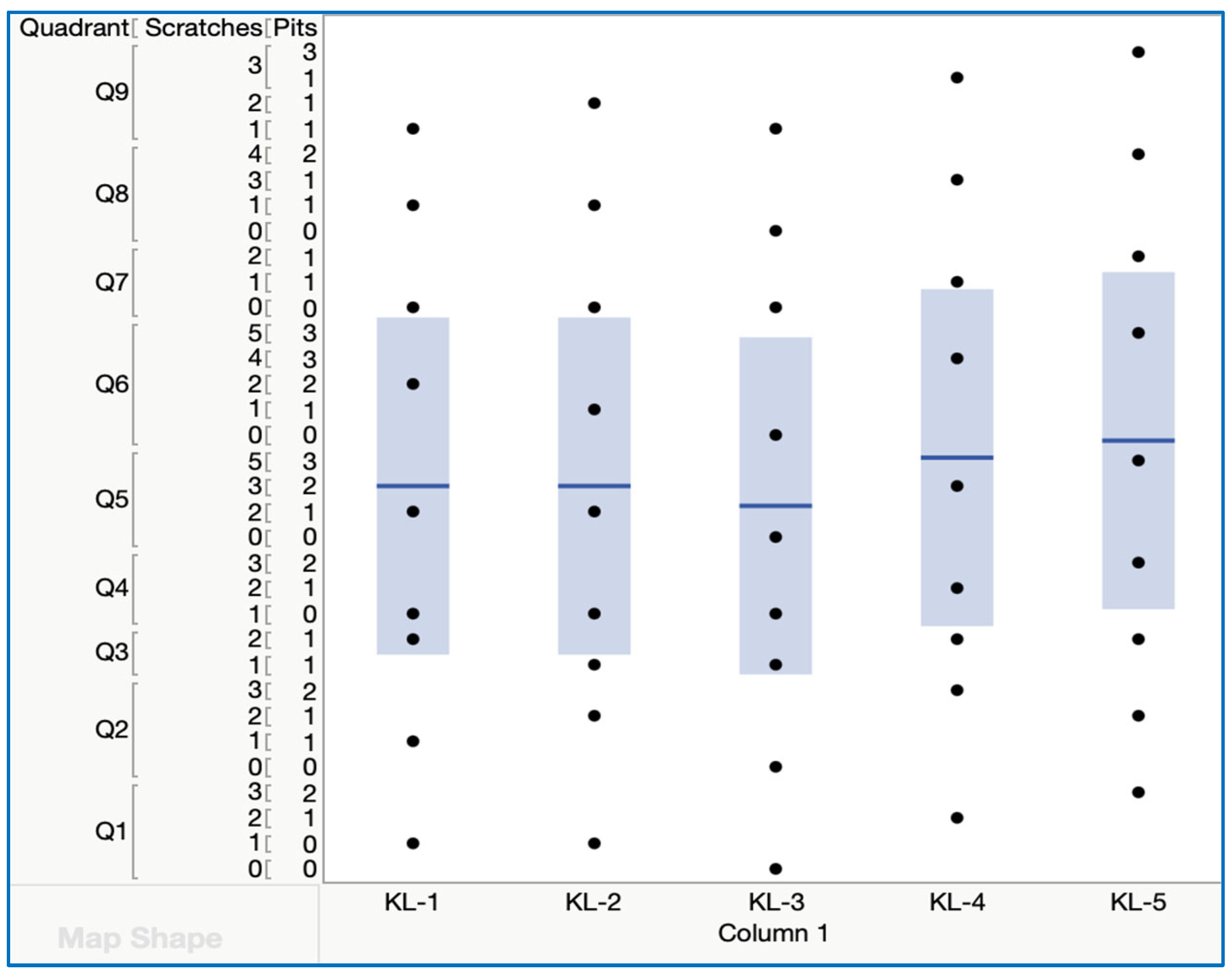 Figure 14). KL-05 recorded the highest WSI at 100% and was closely followed by KL-04, which registered the second highest WSI; thus, they experienced the highest wear. KL-03 contained a much smaller WSI and was determined to be the least worn sample. Supporting WSI counts were validated with visual data plotted in JMP Pro 18 as defect distribution by quadrant.