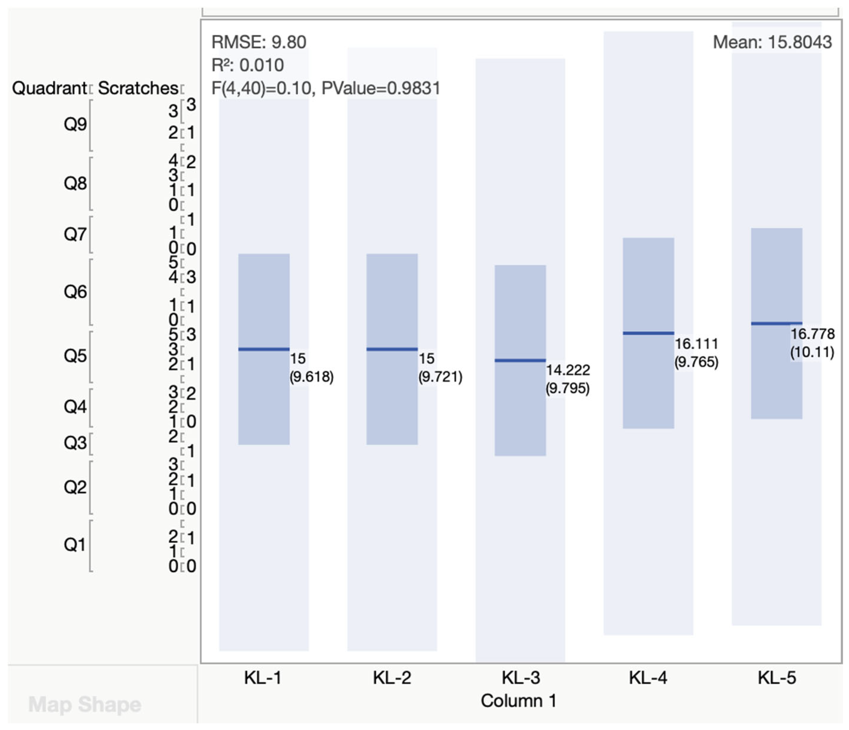 Figure 13 presents the mean defect values and corresponding statistical analysis obtained using JMP, providing a comparative overview of wear severity across liners. The observed trends confirm that liners with higher defect densities also exhibit greater variability in damage, reinforcing the relationship between surface wear accumulation and increased risk of mechanical failure.