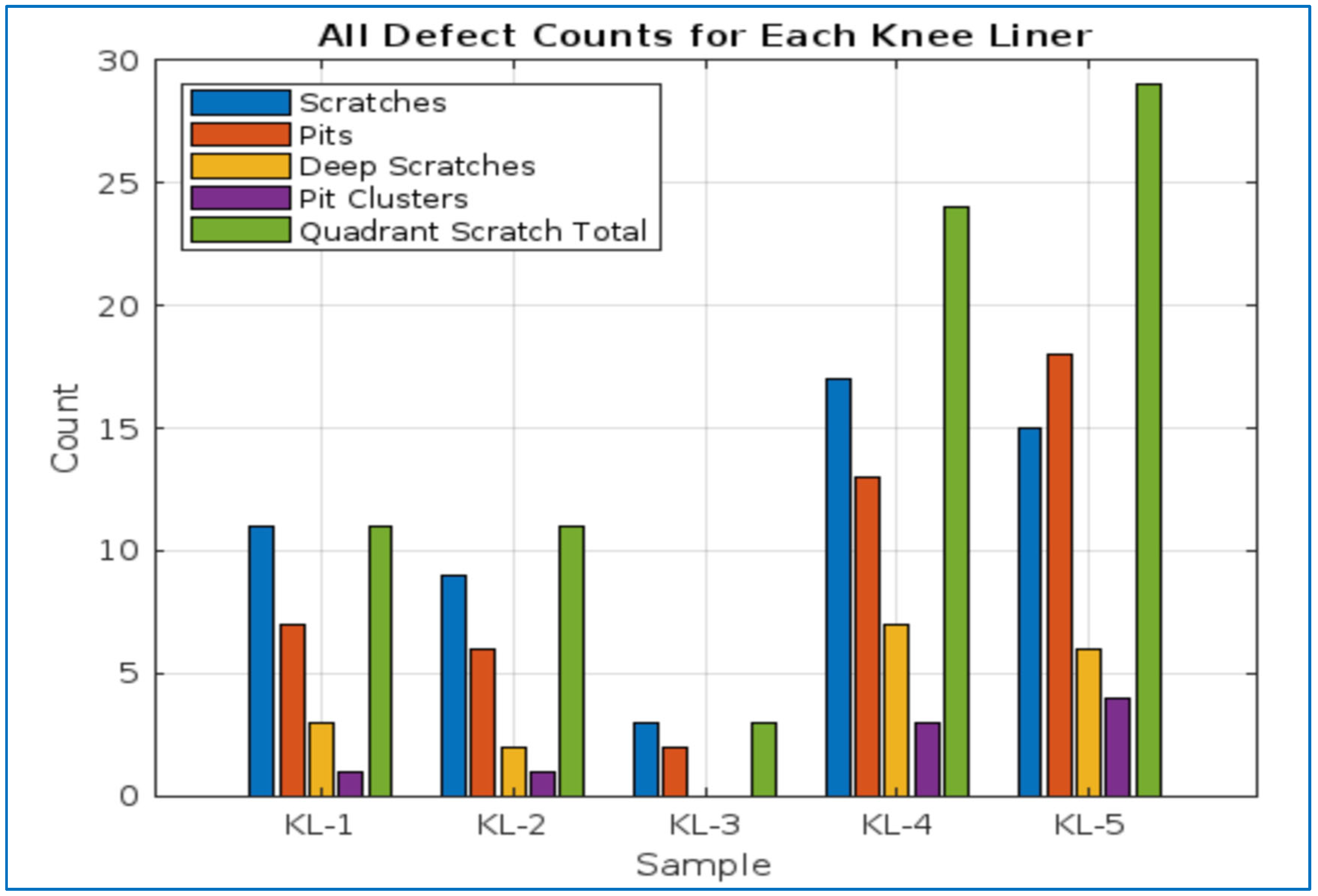 The scratch and pit densities were calculated by first counting the total number of scratches and pits in each knee liner quadrant (Q1 to Q9), and numbers obtained were reported in