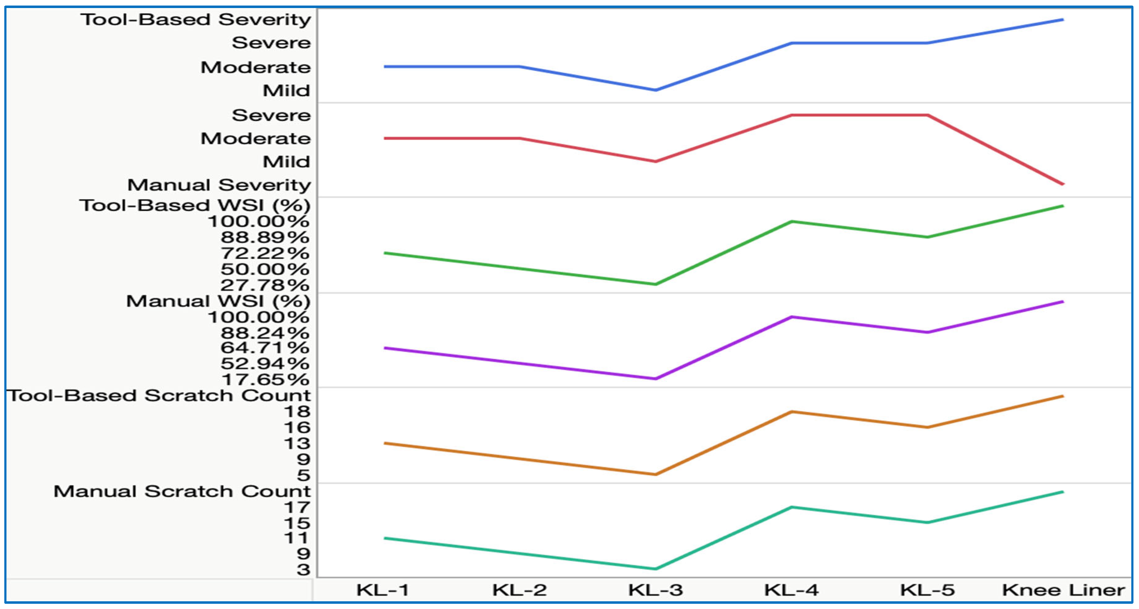 Figure 19, in which the teal line represents the manual scratch count, the orange line indicates the tool-based scratch count, the purple line corresponds to the manual wear severity index (WSI), and the green line represents the tool-based WSI. In addition, the red line denotes manual severity classification, while the blue line represents tool-based severity classification, enabling direct comparison of quantitative counts and qualitative severity trends across liners.
