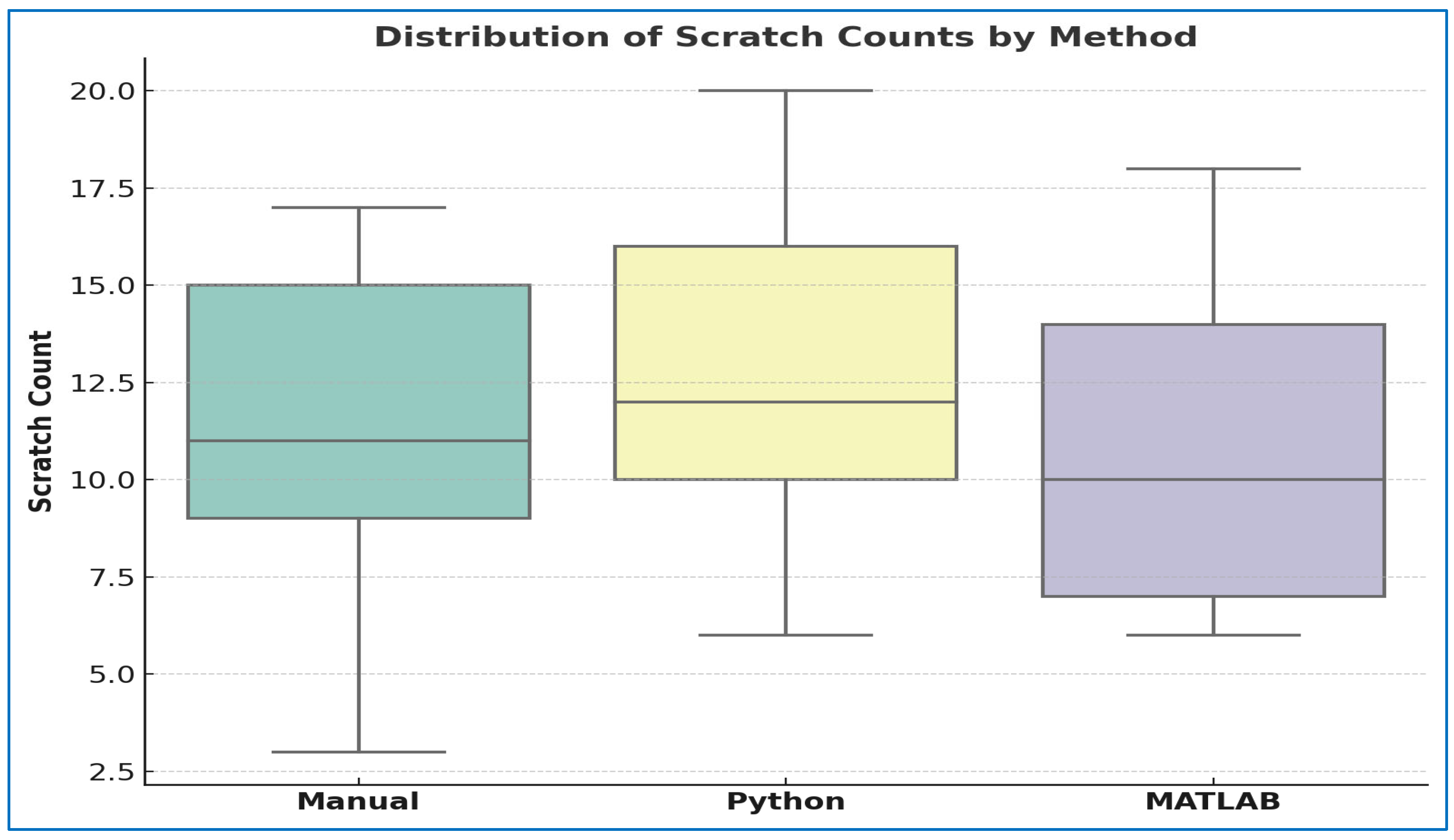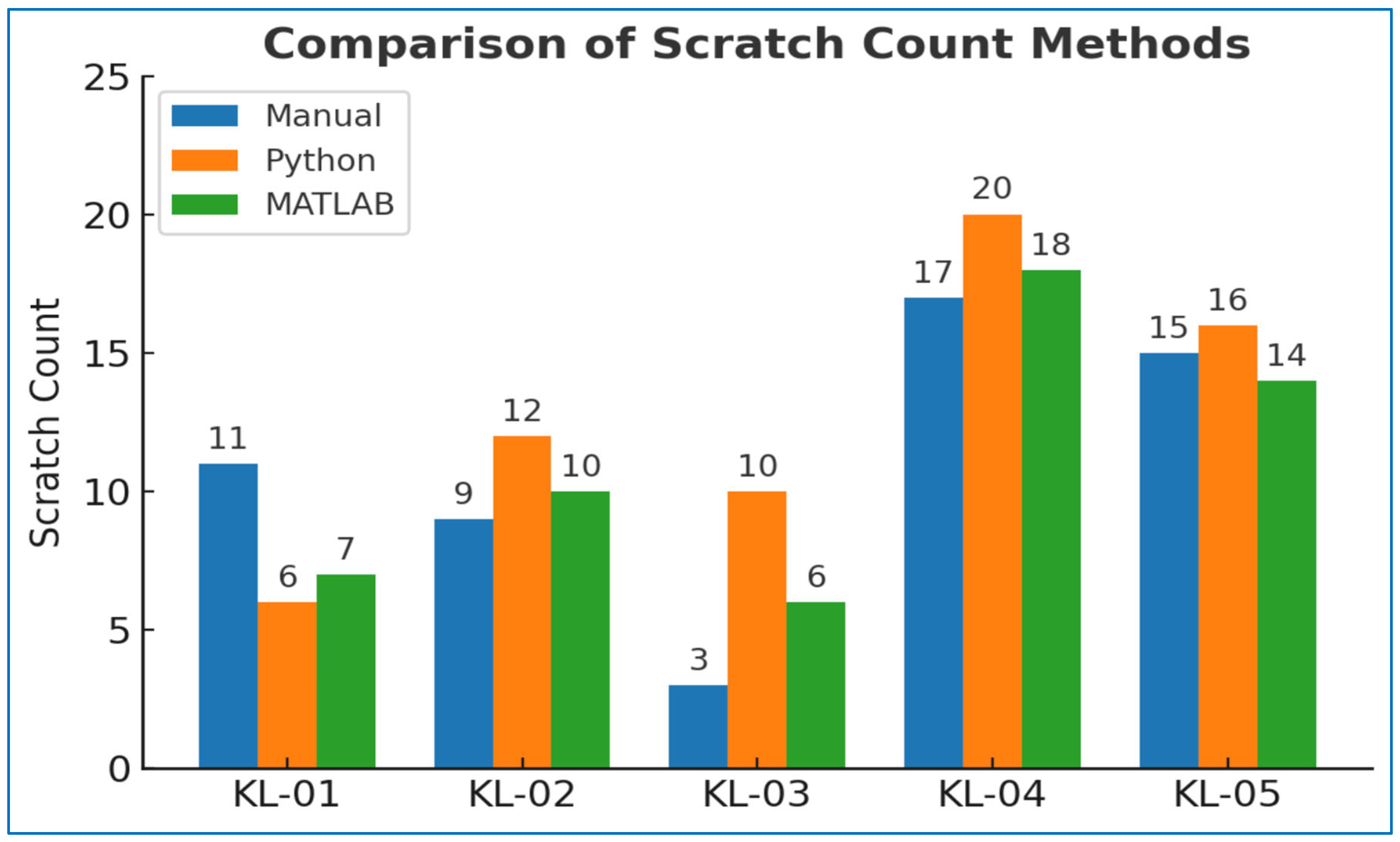A comparative summary of scratch counts obtained through manual assessment and automated analysis using Python and MATLAB is provided in