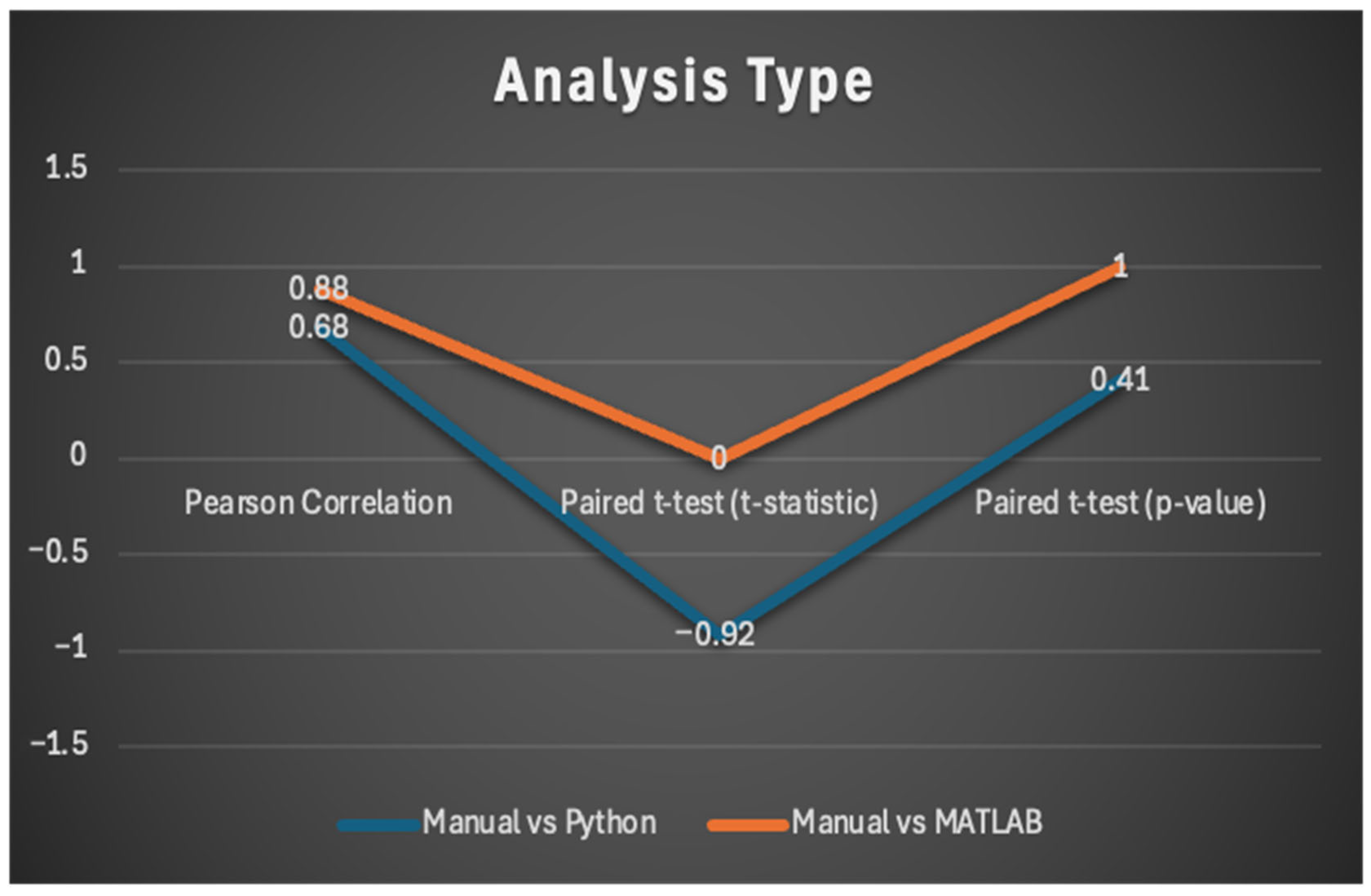 The analysis involves comparing manual wear data with data from Python and MATLAB, using the Pearson correlation and paired t-test. Below is an explanation of the values and what they indicate.