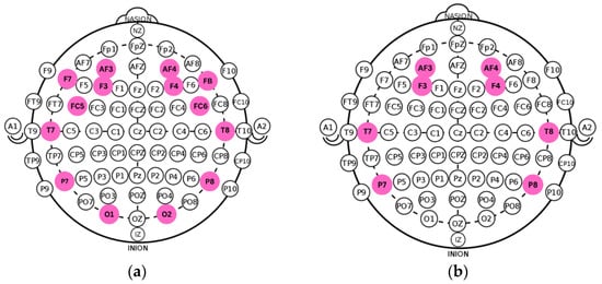 (a) Original electrode layout from the DASPS dataset. (b) Optimized eight-channel configuration aligned with the spatial mapping and acquisition parameters of the acquisition device.