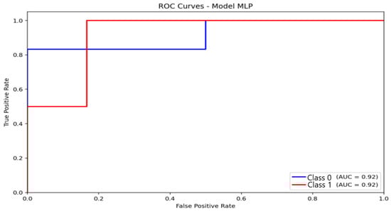 The MLP model (Figure 9) achieved an AUC of 0.92, consistent with its observed accuracy (87.5%) and F1 score (85.9%). The ROC curve increases steadily, indicating a balanced compromise between sensitivity and specificity. Although slightly lower than logistic regression in AUC, the MLP maintained superior F1 performance, suggesting better classification stability across folds and greater robustness against class imbalance.