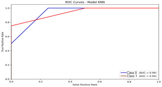 Receiver Operating Characteristic (ROC) curve and corresponding Area Under the Curve (AUC) illustrating the discriminative performance of the K-Nearest Neighbors (KNN) model.