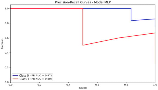 Precision–Recall (PR) curve illustrating classification performance and the precision–recall trade-off for the Multilayer Perceptron (MLP) model.