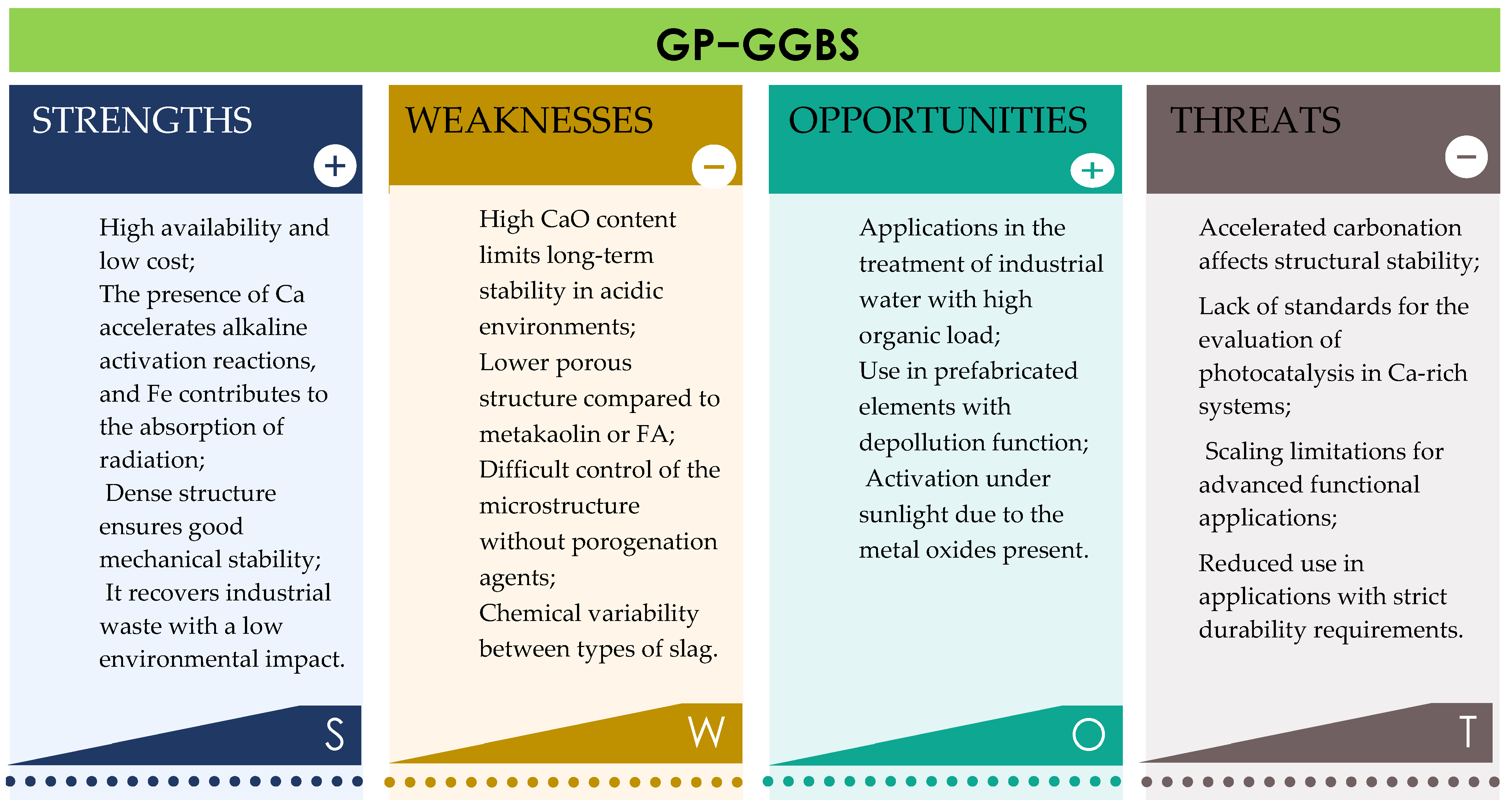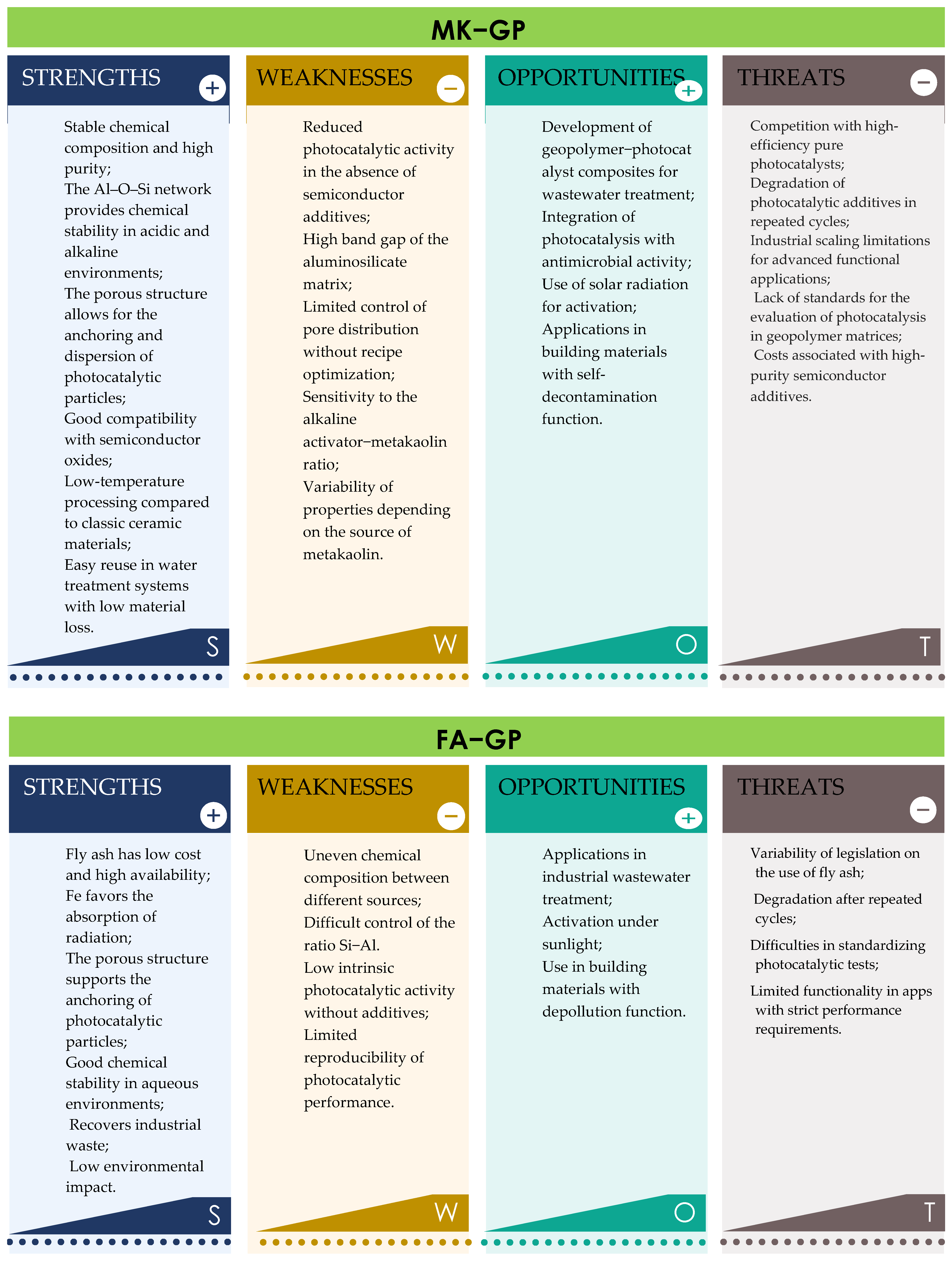 - Easy recycling: By incorporating it into a macroscopic geopolymer material, the recovery and reuse of the catalyst after water or air purification becomes much simpler and more economical [68].