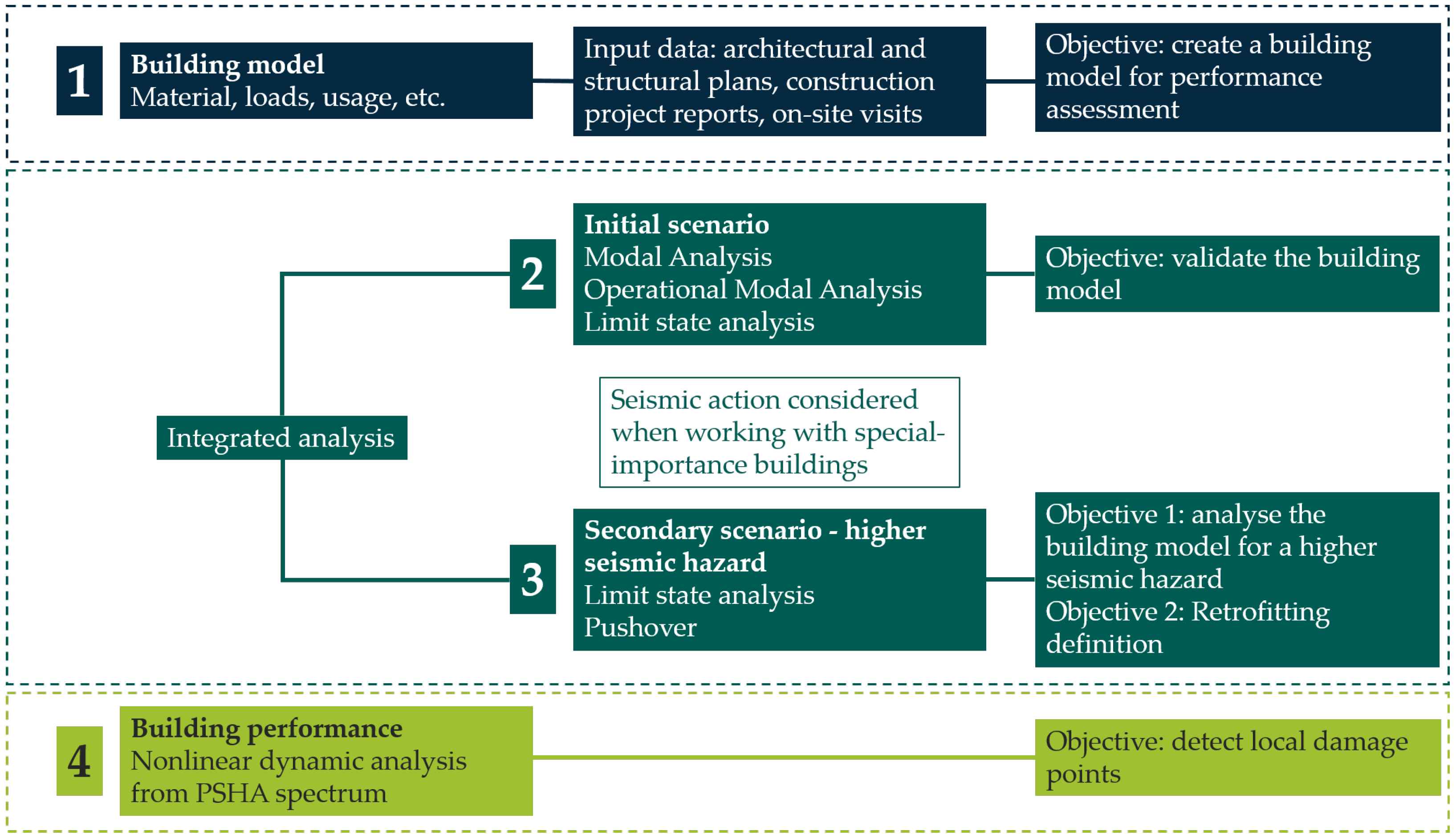- Evaluation of existing seismic capacity through analysis of the strength and stiffness of structural elements and their energy-dissipation capacity.