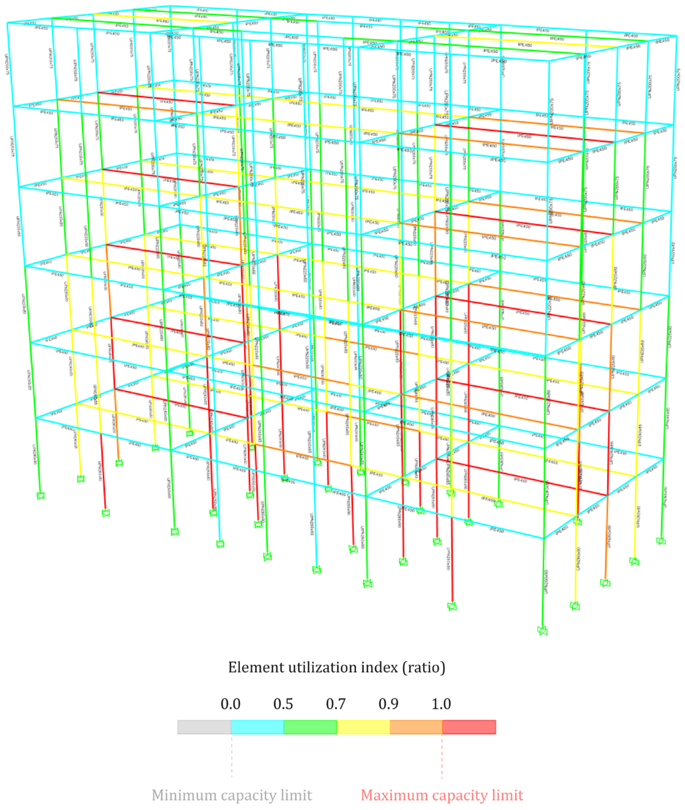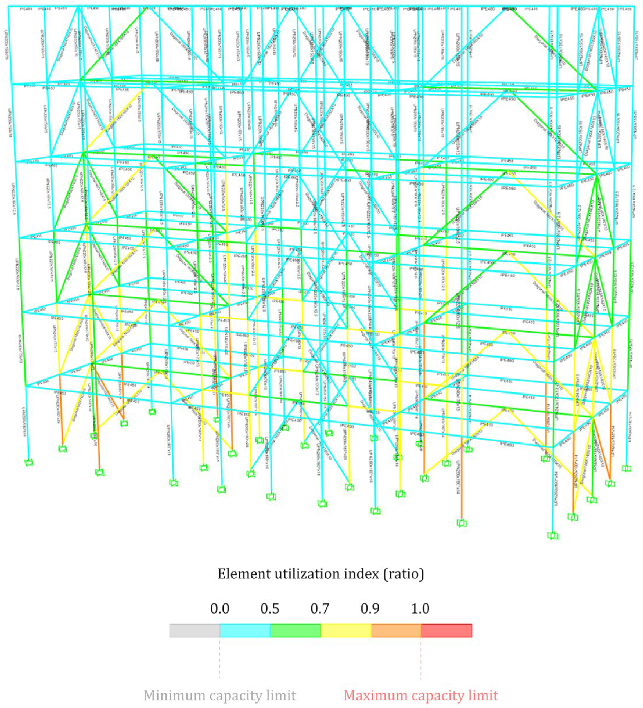 ![]() | Material: rolled steel Profile: double UPN box section Height: 415 cm per level Dimensions per level. Basement: 26 × 18 × 1.4 cm; Ground floor: 24 × 17 × 1.3 cm, First floor: 22 × 16 × 1.25 cm; Second floor: 22 × 16 × 1.25 cm; Third floor: 20 × 15 × 1.5 cm; Fourth floor: 20 × 15 × 1.5 cm |