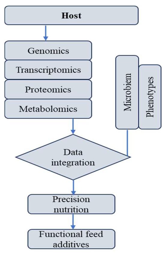 Despite these promising findings, the reproducibility of outcomes across farms remains inconsistent due to variation in microbial strains, plant species, extraction methods, and interactions with basal diets [12,17]. Moreover, the biological effects of postbiotics and phytogenics are influenced by host genotype, microbiota composition, and environmental factors [6,7,8]. Emerging omics-based tools, including metagenomics, transcriptomics, proteomics, and metabolomics, now allow systematic elucidation of host–microbe–metabolite interactions [18,19,20].