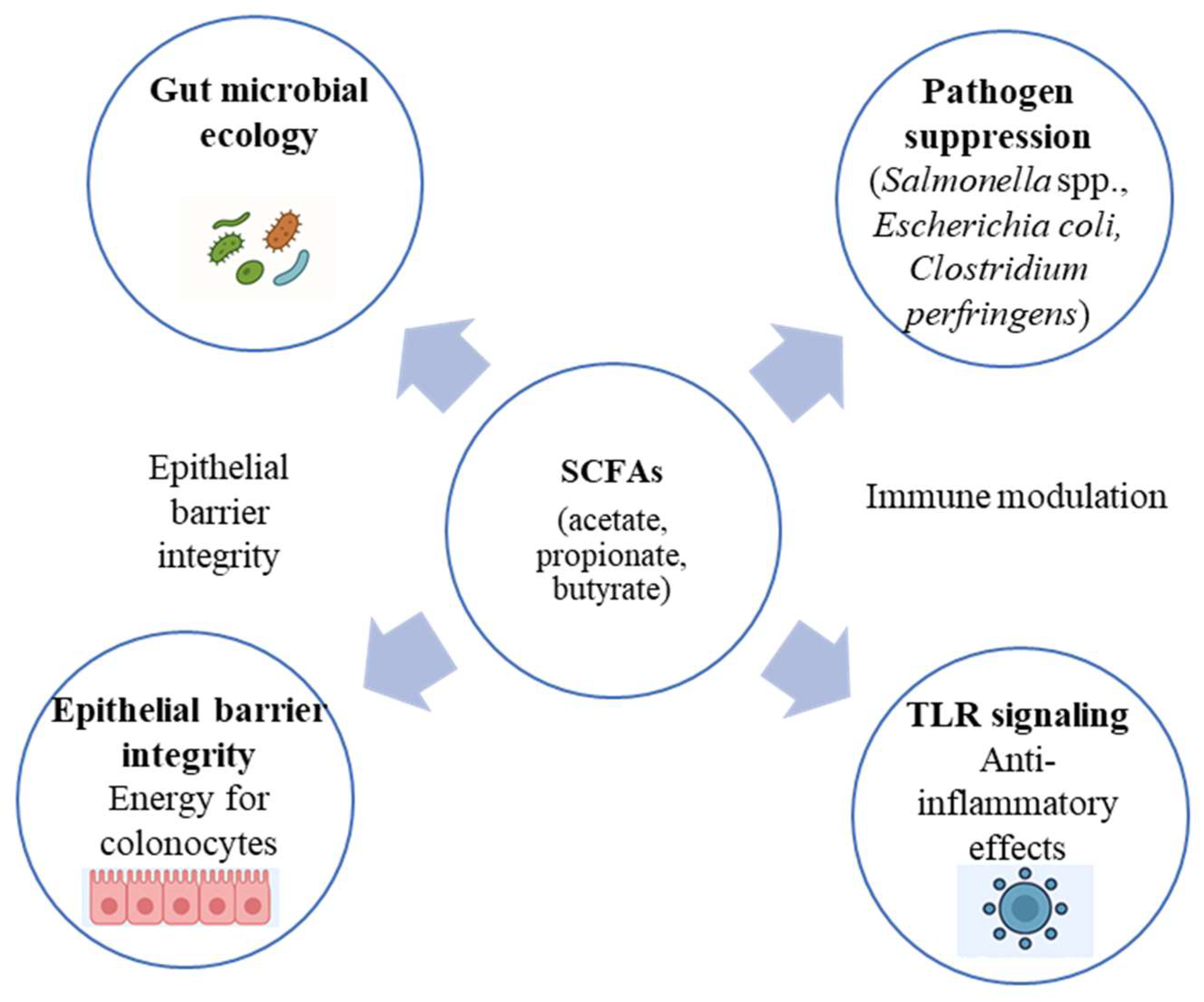 | Inanimate microbial cells (heat-killed or inactivated bacteria; paraprobiotic/postbiotic preparations) | Immunomodulation; barrier support; pathogen control | Innate immune receptor signaling (TLRs, NOD-like receptors); epithelial barrier support | Improved gut health indicators and growth performance in poultry and swine; proposed as alternatives to antibiotic growth promoters [13,24]. |