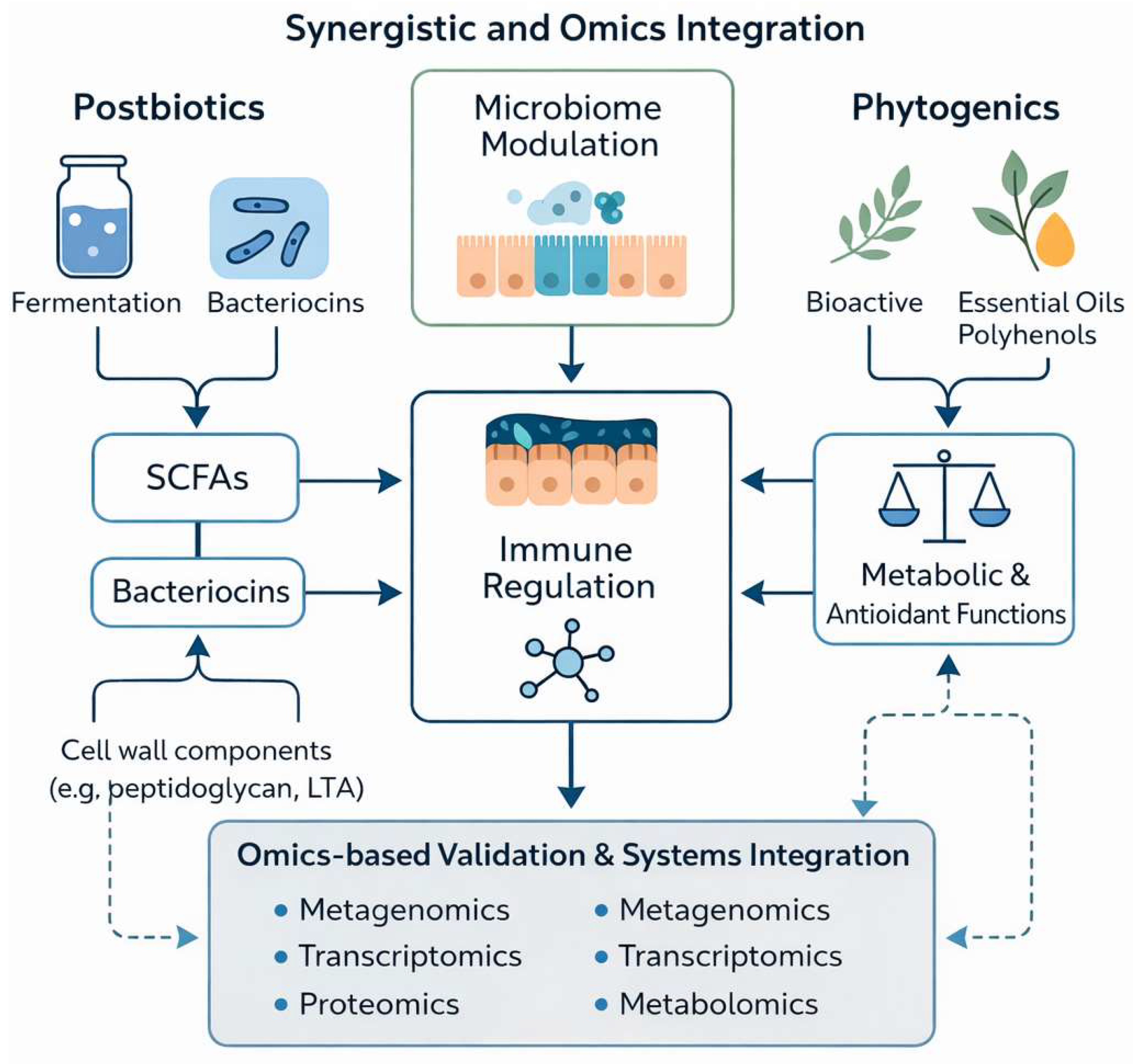 6. Synergistic and Combined Use of Postbiotics and Phytogenics