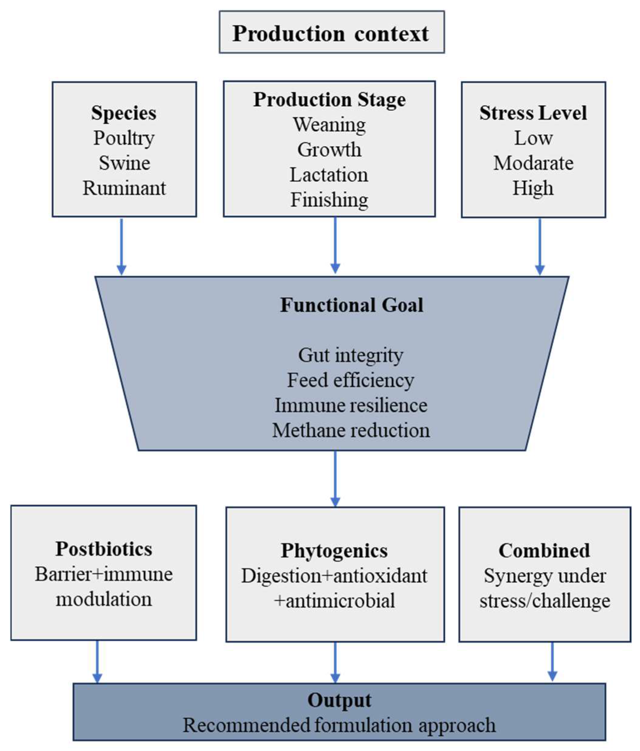 | Best production stage | Weaning, early life | Growth, finishing | Stress/challenge periods |