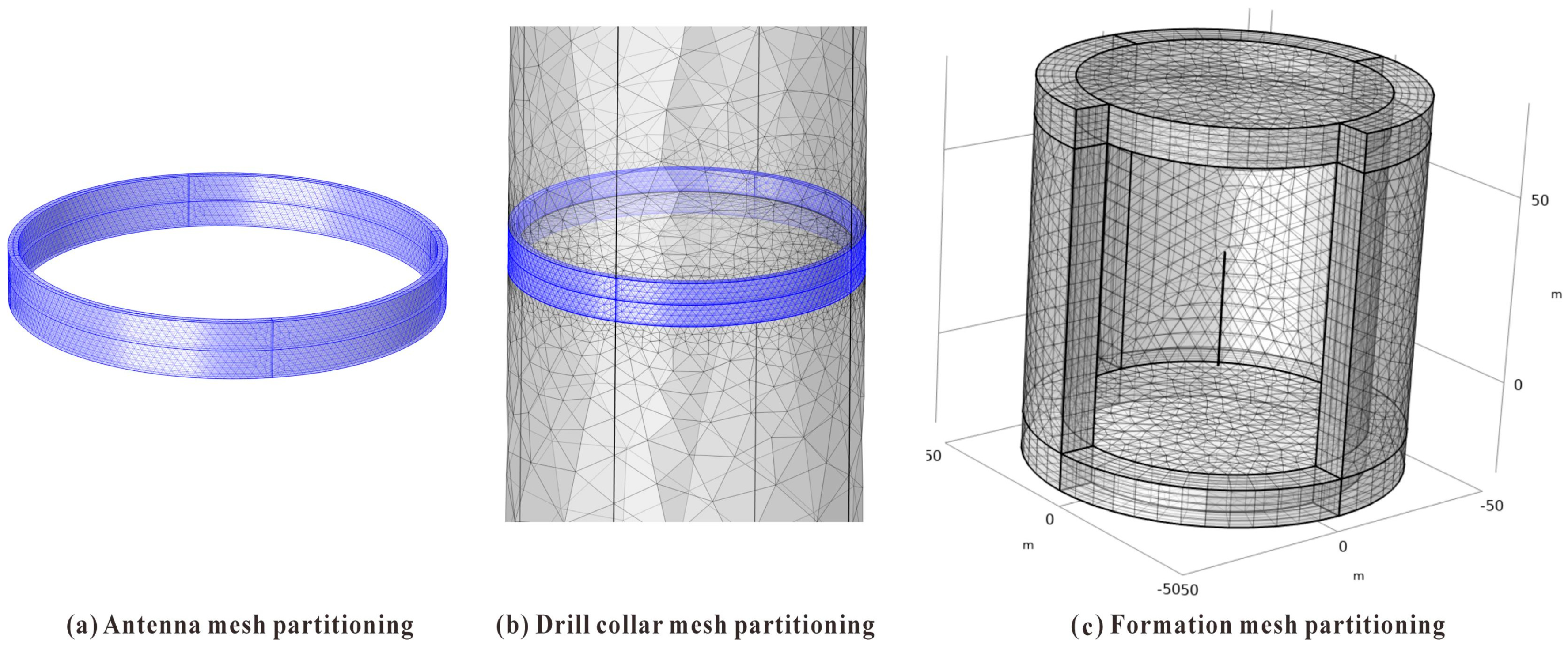 - Li, W.; Nie, Z.; Sun, X.; Chen, Y. Numerical Modeling for Excitation and Coupling Transmission of Near Field Around the Metal Drilling Pipe in Lossy Formation. IEEE Trans. Geosci. Remote Sens. 2014, 52, 3862–3871. [Google Scholar] [CrossRef]