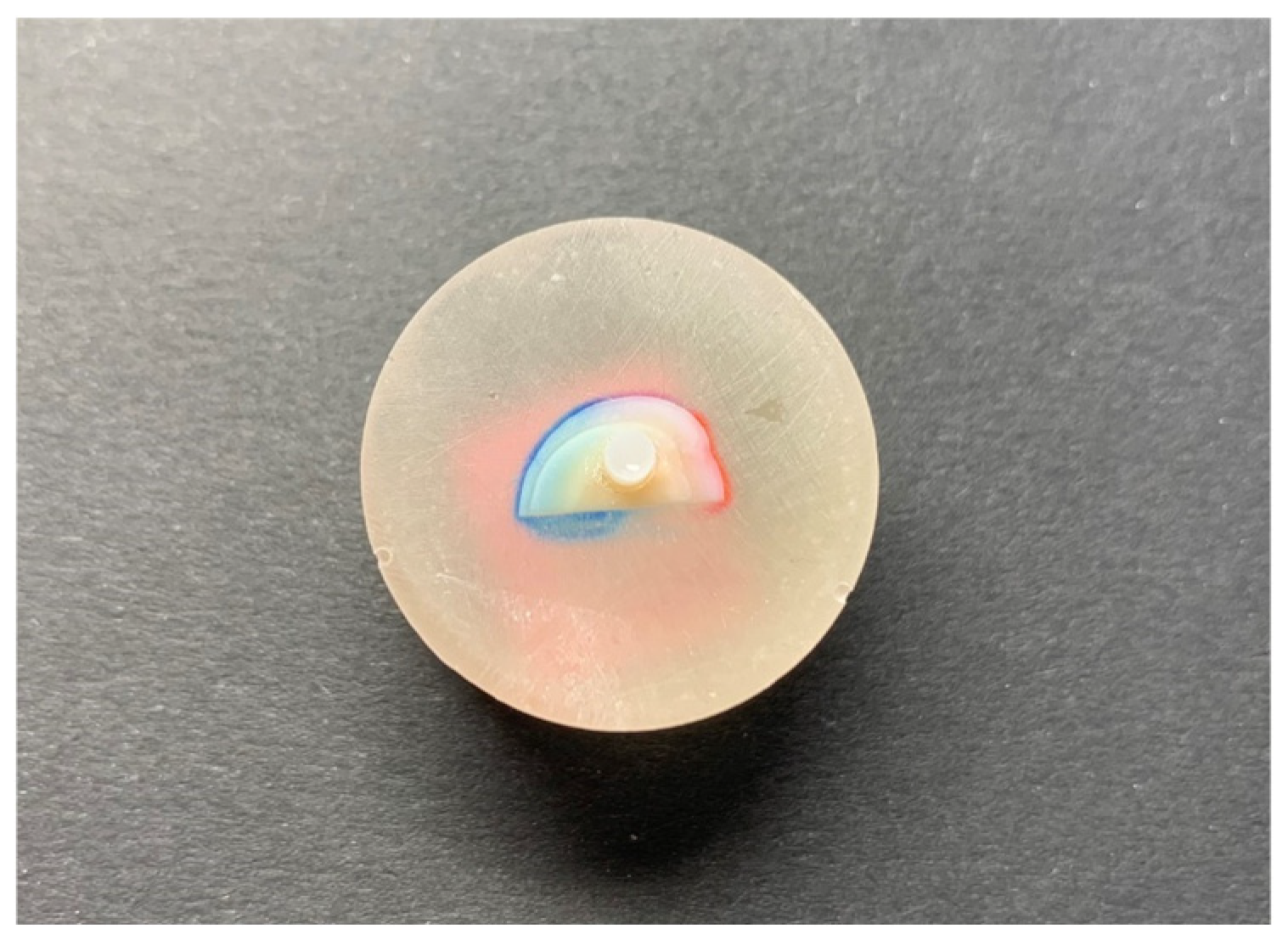 For the experimental groups, the silver diamine fluoride (SDF) desensitizer, Riva Star Aqua (SDI, Bayswater, Victoria, Australia), was applied to the dentine surfaces using a medium microbrush and left undisturbed for 60 s. In the second step, the potassium iodide (KI) solution was applied with a fresh microbrush and agitated until the initial creamy white precipitate became completely clear. The treated surfaces were then rinsed with an air–water spray for 10 s and gently air-dried. Following this pretreatment, the adhesive systems and composite cylinders (2.38 mm diameter, 2.0 mm height) were applied and light-cured for 20 s, using the same parameters as the control groups. This procedure produced six experimental groups: G-Premio Bond + Riva Star and Clearfil SE + Riva Star, each evaluated at intervals of 1, 3, and 6 months.