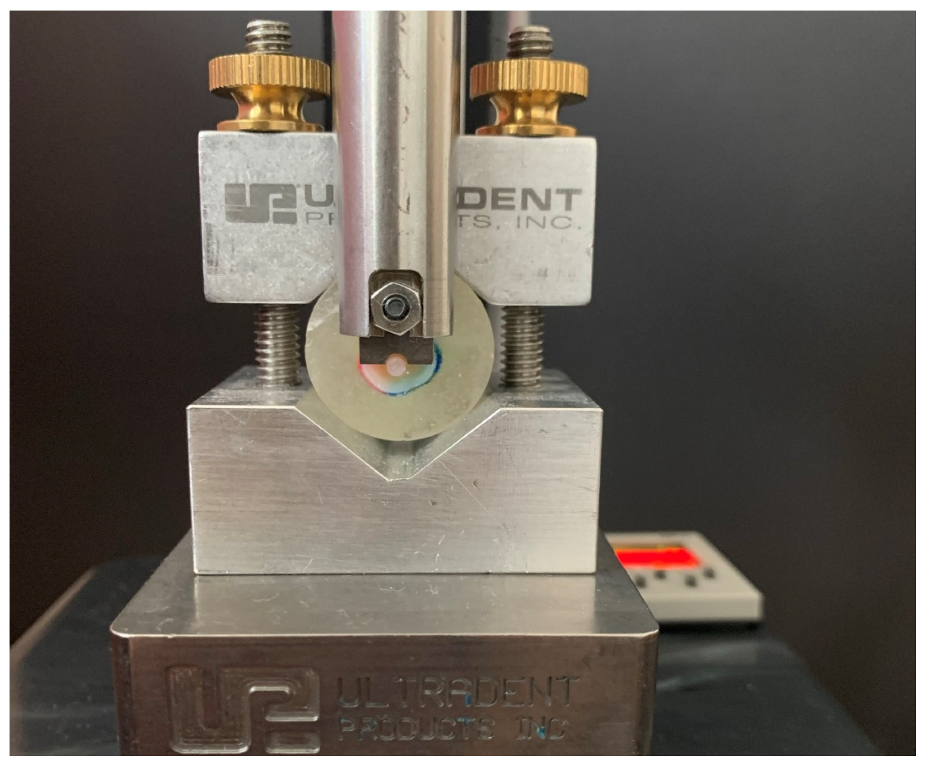 Figure 2). A load was applied at a constant crosshead speed of 1 mm/min until adhesive failure occurred, resulting in separation of the composite cylinders from the dentine surface. All measurements were performed in compliance with ISO 29022:2013 standards [