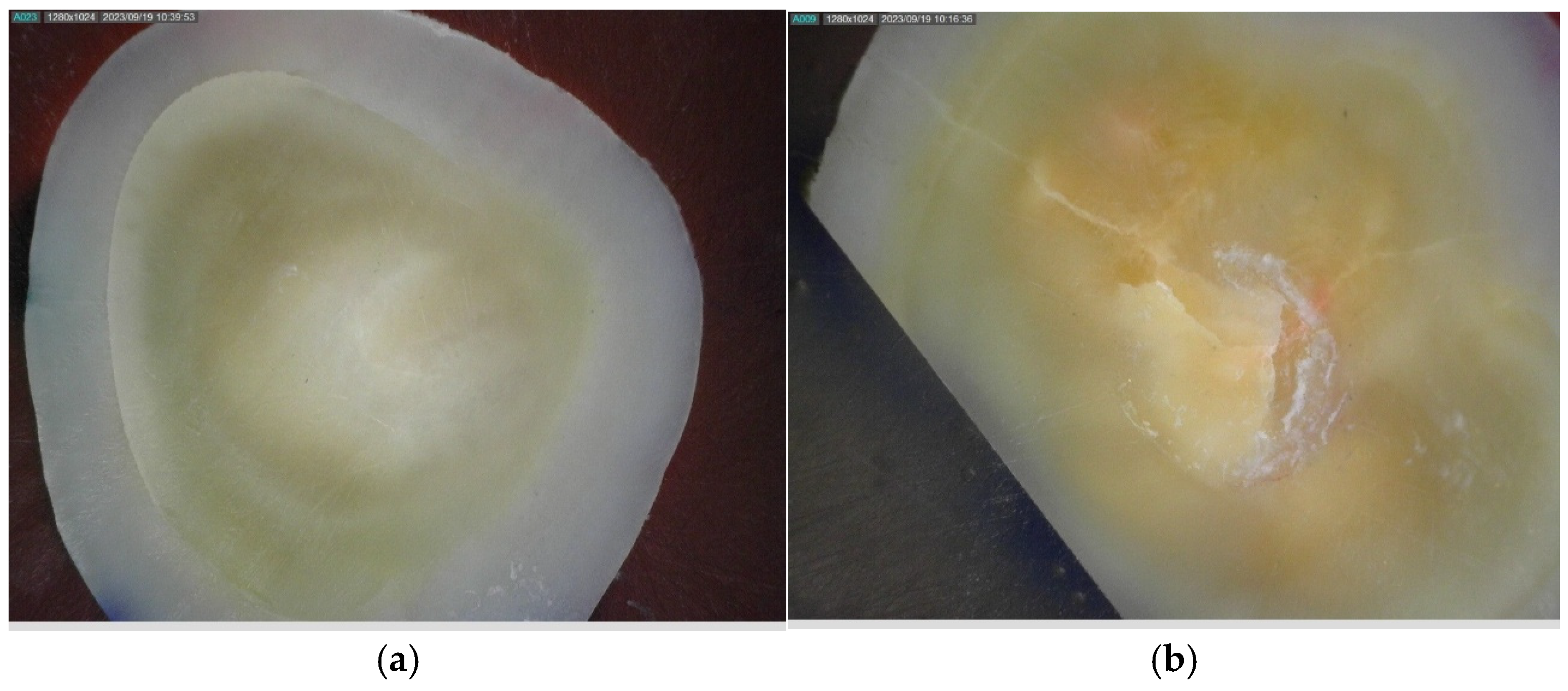 Figure 3) were examined using optical magnifying loupes at 3.6× magnification (Carl Zeiss Meditec AG, Oberkochen, Germany) to determine the type of fracture, i.e., the mode of failure. If the fracture line passed between the tooth structure and the composite cylinder, the failure mode was classified as adhesive. The fracture was considered mixed when the fracture line ran partially along the adhesive interface and extended into one of the substrates. In cases of mixed failure, fractures occurring in dentine or in the composite were distinguished, depending on which substrate was involved in the fracture line. If more than 75% of the bonded surface involved either dentine or composite, the failure mode was classified as cohesive. In our study, the fracture paths were consistently localized at the interface or transitioned between the interface and the bulk material, resulting exclusively in adhesive or mixed-mode failures. As the incidence of cohesive failure was zero (0%) for all specimens, it was omitted from the statistical analysis to avoid redundancy and to focus the discussion on the observed competition between adhesive and mixed-mode behaviors.