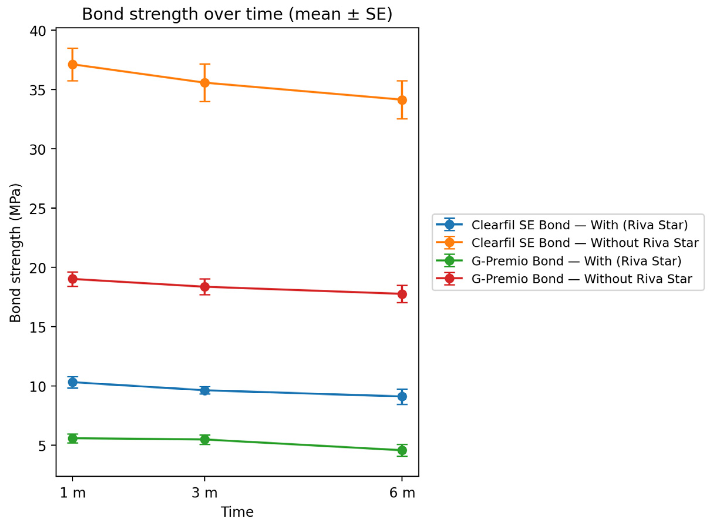 Clearfil SE Bond 2 and G-Premio Bond represent different generations of dental adhesives. Comparisons between adhesive systems are commonly performed to evaluate differences in bond strength and durability. According to the available literature, no studies have evaluated the bond strength of G-Premio Bond to dentin pretreated with SDF and KI, whereas only a limited number of studies have investigated Clearfil SE Bond 2 on dentin pretreated with SDF [