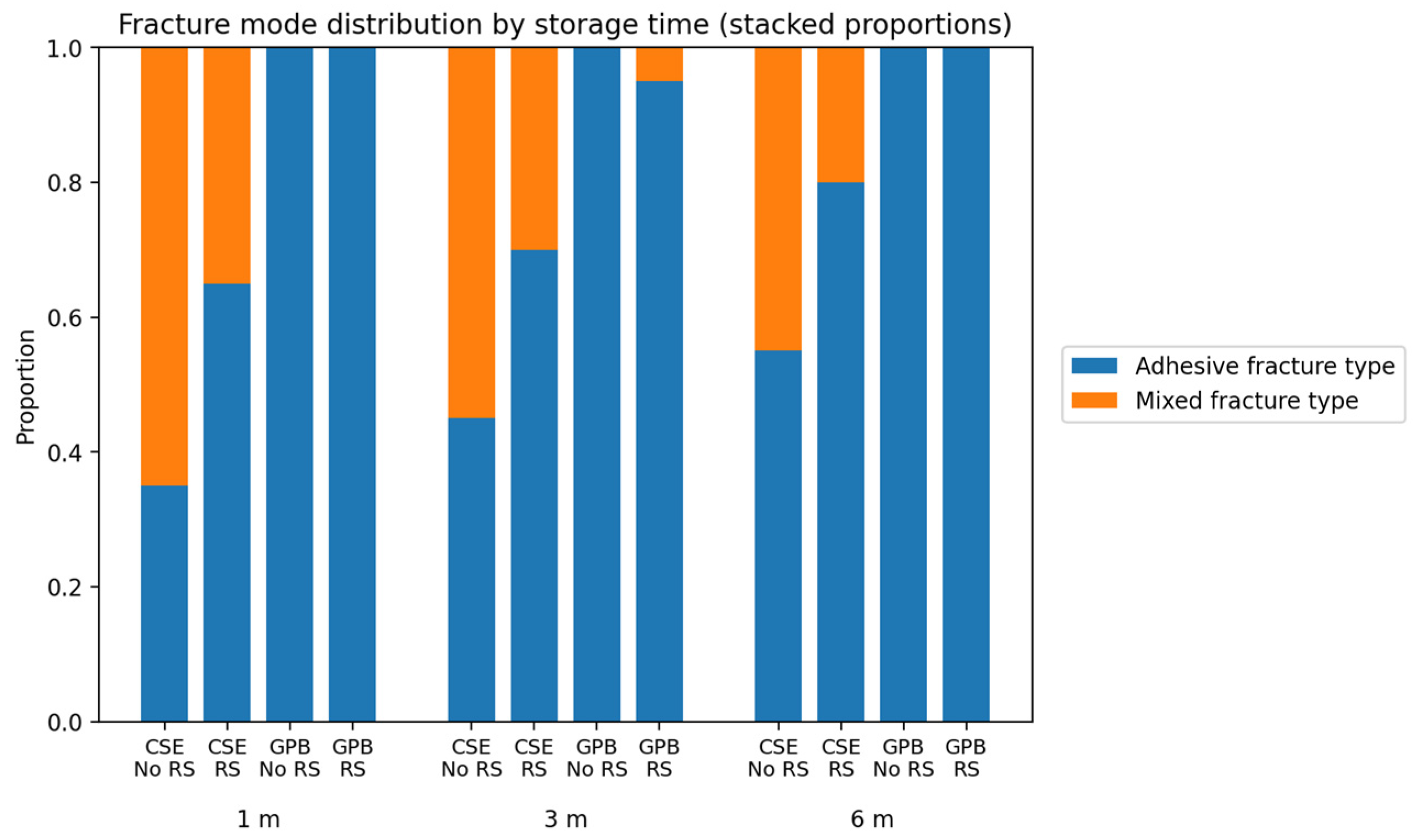 Bond strength (MPa) was analyzed using a three-way factorial model (Adhesive × Pretreatment × Time). Model residuals deviated from normality (Shapiro–Wilk p = 5.67 × 10−7) and variances were heterogeneous across groups (Levene p = 3.46 × 10−14). Therefore, heteroscedasticity-consistent (HC3) robust standard errors were used for inference (Wald F tests). The significance level was set at α = 0.05. Fracture mode (adhesive vs. mixed) was analyzed using contingency tables with χ2 tests (and Fisher’s exact test when expected counts were small). The authors hereby disclose that generative artificial intelligence (GenAI) has been used in statistical analysis.