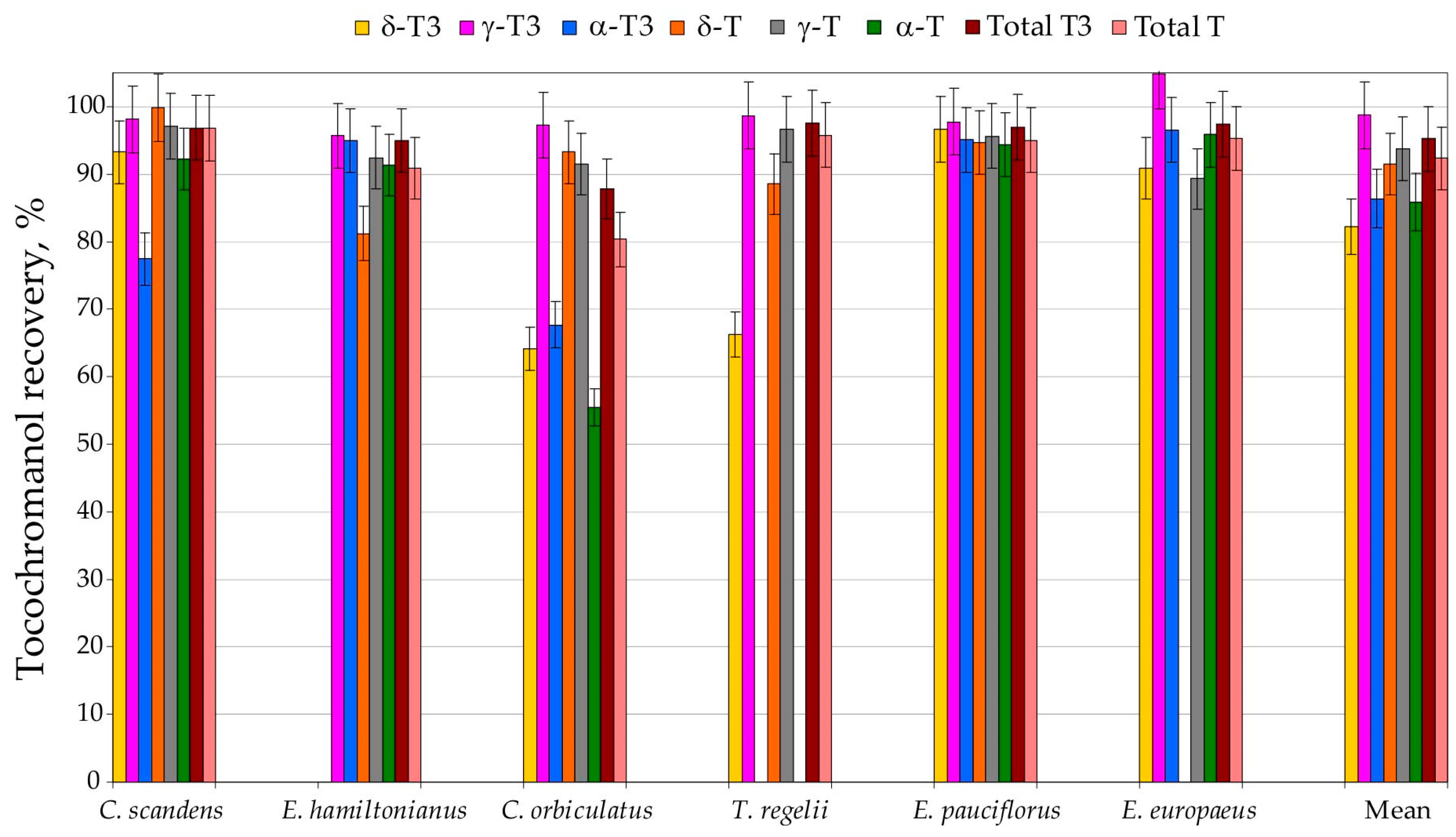 - Górnaś, P.; Baškirovs, G.; Siger, A. Free and esterified tocopherols, tocotrienols and other extractable and non-extractable tocochromanol-related molecules: Compendium of knowledge, future perspectives and recommendations for chromatographic techniques, tools, and approaches used for tocochromanol determination. Molecules 2022, 27, 6560. [Google Scholar] [PubMed]