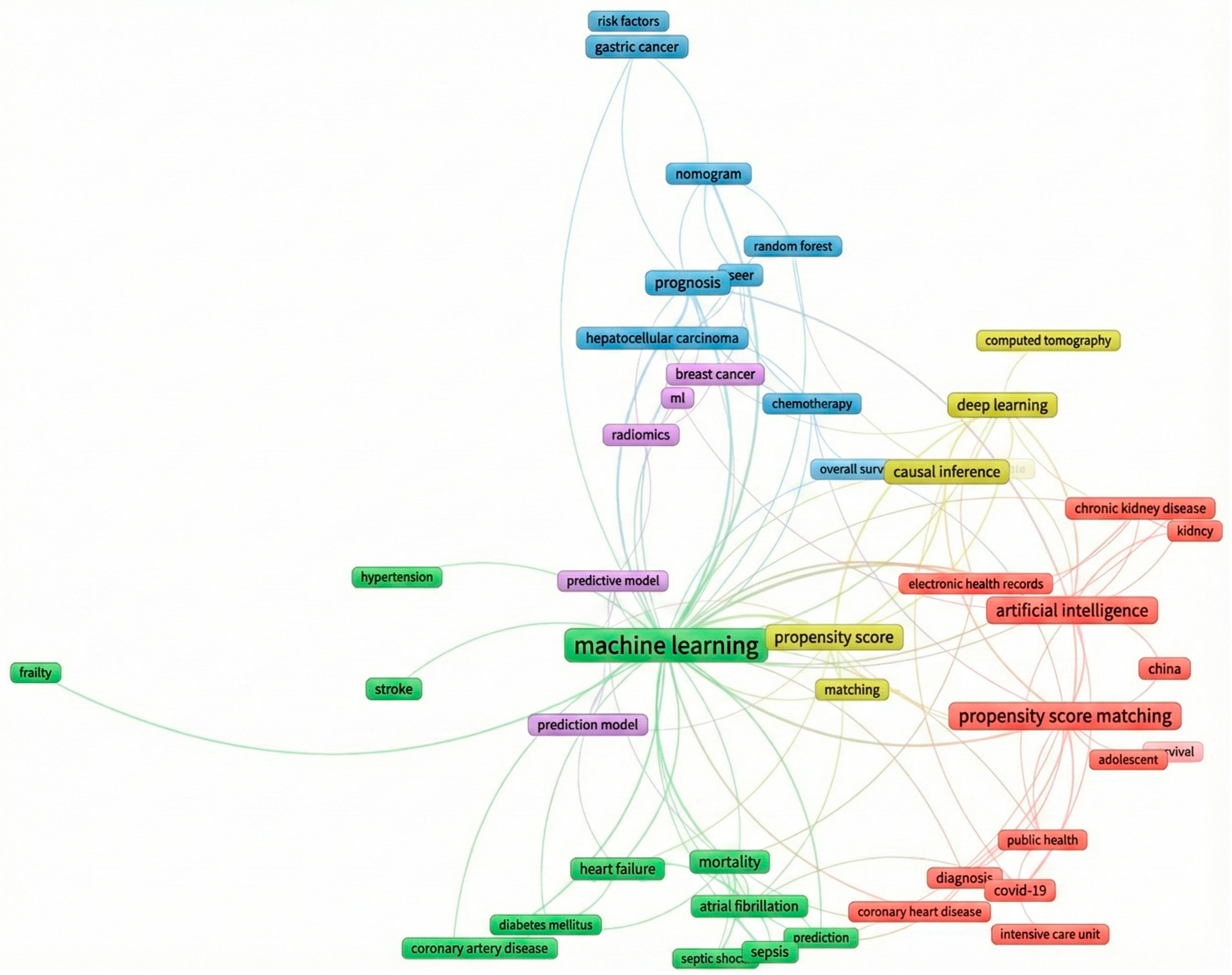 | Cancer management Red (15 author keywords) | Breast cancer—SEER Hepatocellular carcinoma—SEER—chemotherapy-survival Gastric cancer—random forest Natural language model, prediction modelling | [51] [52,53] | [54,55] [56] [57,58] [59,60] |
