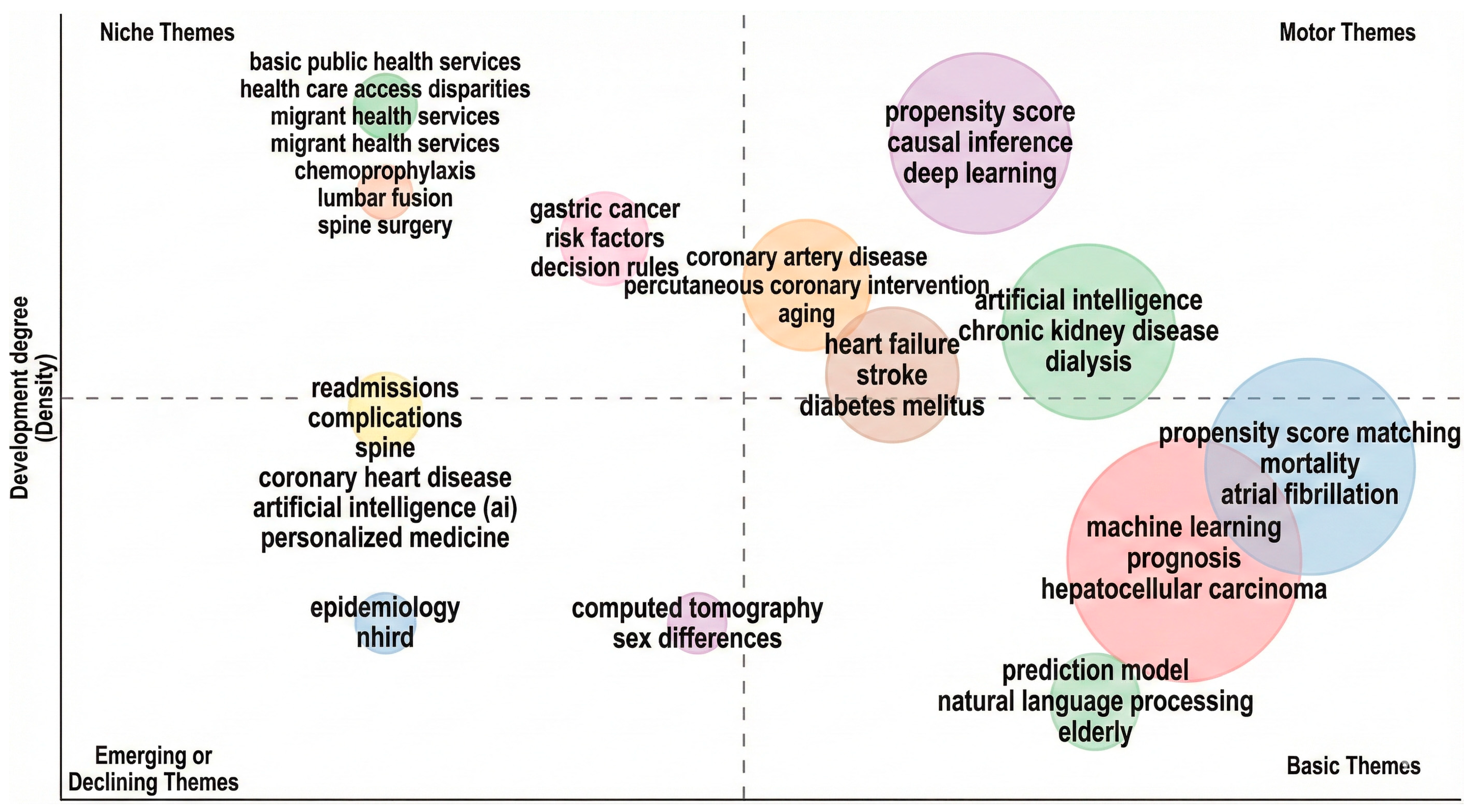 - Vertical Axis (Y): Development Degree (Density). This measures the internal strength and cohesion of a theme (the strength of links within the cluster).