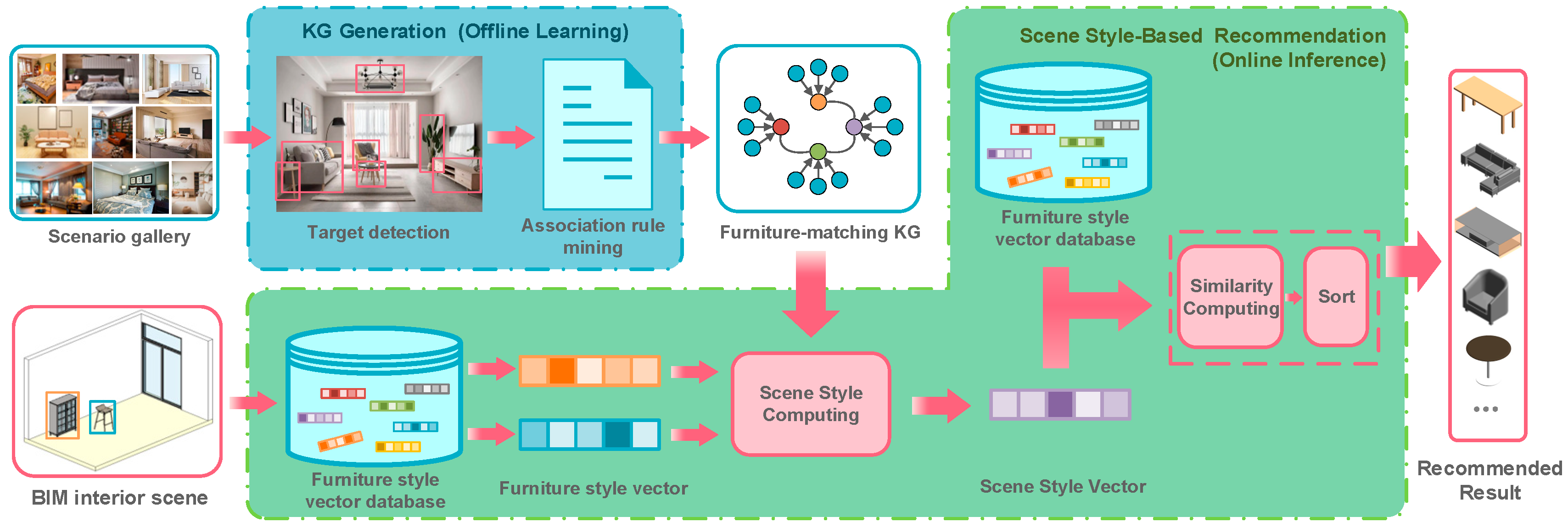 - Visual Path: It retrieves (or computes) the style vectors v(pi) for all existing furniture from BIM-derived 2D renderings/projections of the corresponding 3D BIM families and scene objects, and accesses them from the vector database.
