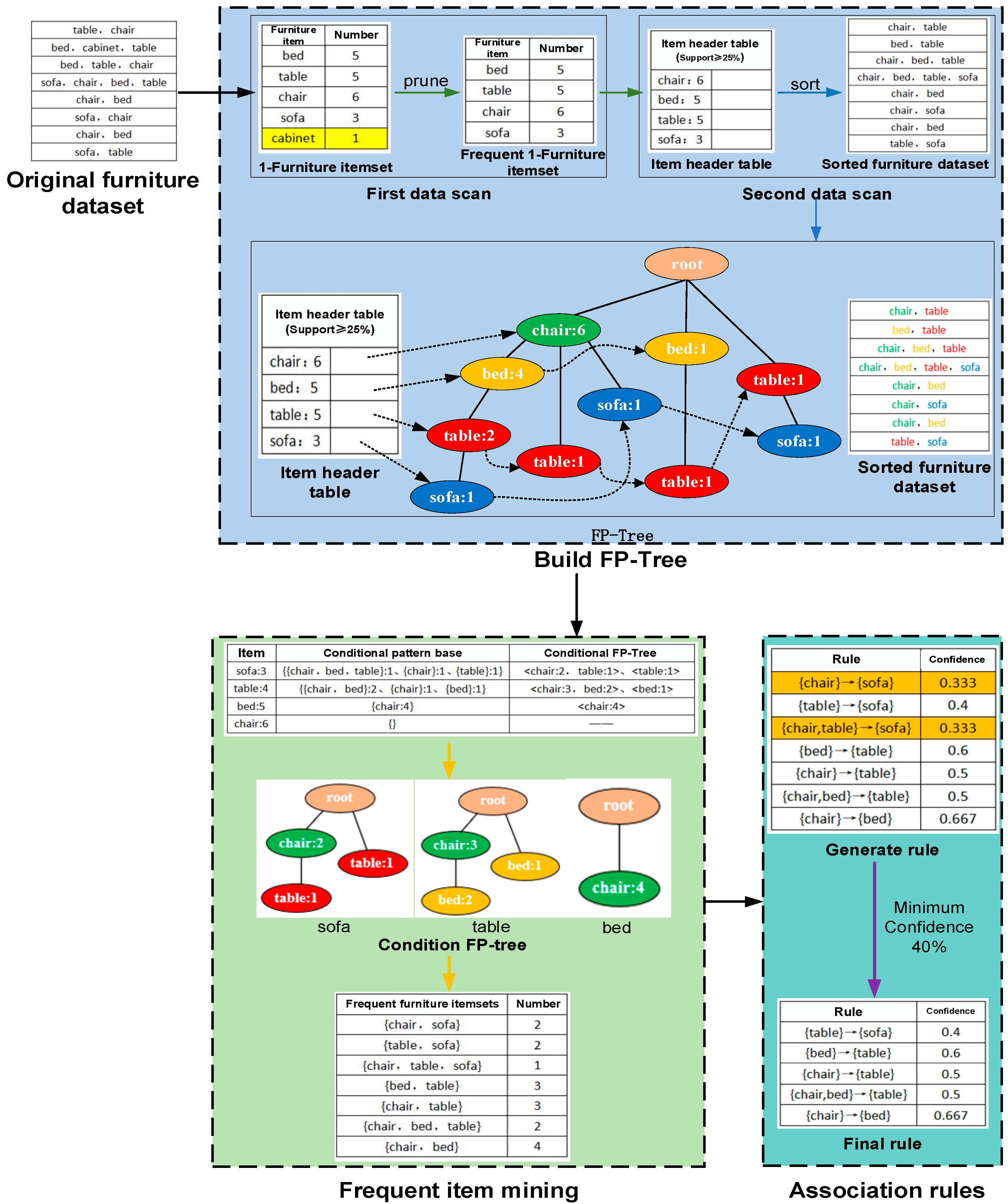 - Contextual Pruning: For instance, as shown in Figure 4, for the item “sofa,” the FP-tree reveals three distinct design paths: {chair:1, bed:1, table:1, sofa:1}, {chair:1, sofa:1}, and {table:1, sofa:1}. Consequently, the conditional pattern base for “sofa” is derived as {{chair, bed, table}:1, {chair}:1, {table}:1}.