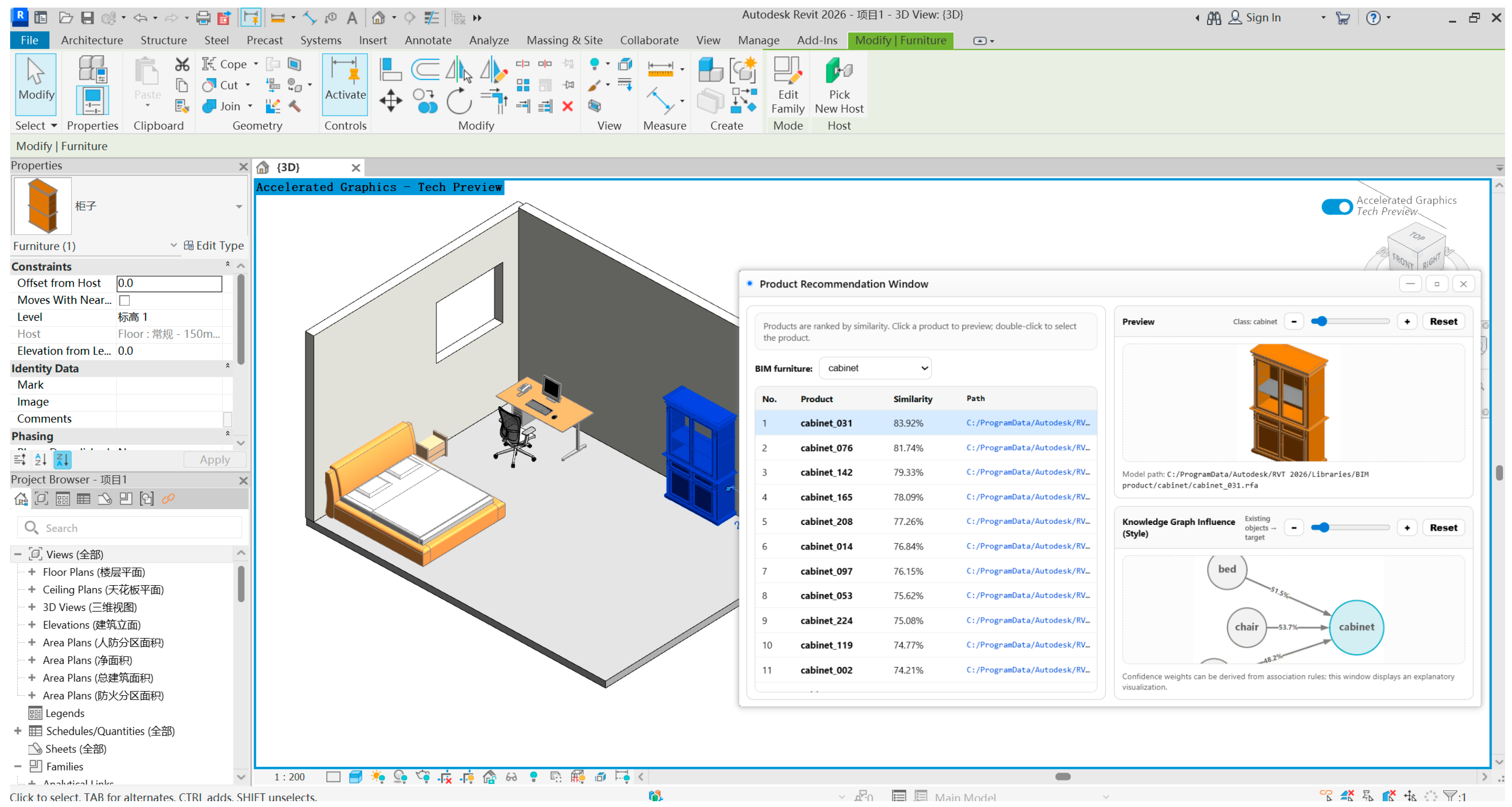 - Logical Path: It queries the Knowledge Graph to determine the dynamic attention weights w based on the relationships between existing furniture categories and the target furniture type.