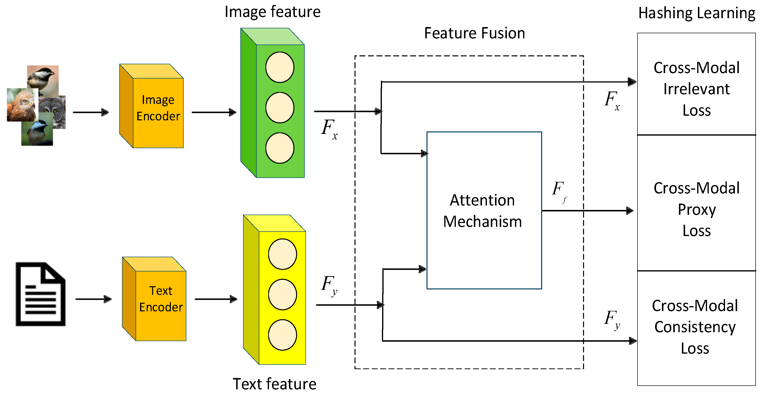 To overcome the challenges identified in existing approaches, we introduce a feature fusion-based proxy hashing framework designed for cross-modal retrieval tasks. Raw image and text data are fed into a feature extraction network to obtain image and text features, respectively. These features are then integrated through a feature fusion module to combine multimodal semantic information, generating fused features that are both discriminative and robust. Finally, the hash function learning process is optimized through a carefully designed joint loss function that integrates three complementary components: cross-modal proxy loss, cross-modal irrelevant loss, and cross-modal consistency loss. In the feature extraction stage, the proposed method employs the CLIP model as its backbone architecture, replacing conventional convolutional neural networks (CNNs). CLIP incorporates a dual-encoder architecture comprising a visual encoder for image processing and a transformer-based encoder for textual input. On the image side, the ViT-B/16 pre-trained model of CLIP is used for feature extraction. On the text side, Byte-Pair Encoding (BPE) is employed for tokenization, and the processed text vectors are input into the text transformer encoder. For the feature fusion module, inspired by the multi-head attention mechanism in the Transformer architecture, a cross-modal feature fusion mechanism is designed. It integrates semantic information from images and text via an attention-weighted strategy to produce a unified feature representation with both discriminability and robustness. For the hash learning module, we propose a joint loss function comprising cross-modal proxy loss, cross-modal irrelevant loss, and cross-modal consistency loss, which replaces traditional pairwise or triplet losses. This design effectively preserves inter-sample similarity rankings and mitigates inter-modal semantic gaps. Specifically, the cross-modal proxy loss aligns heterogeneous features via proxy representations to bridge semantic gaps; the cross-modal irrelevant loss reduces modality-specific noise by penalizing irrelevant correlations between irrelevant pairs; and the cross-modal consistency loss ensures the compatibility and effectiveness of fused features, providing stable and semantically rich inputs for hash code generation. This multi-objective optimization framework enhances the discriminability of hash codes while improving the model’s robustness and generalization capability in large-scale cross-modal retrieval.