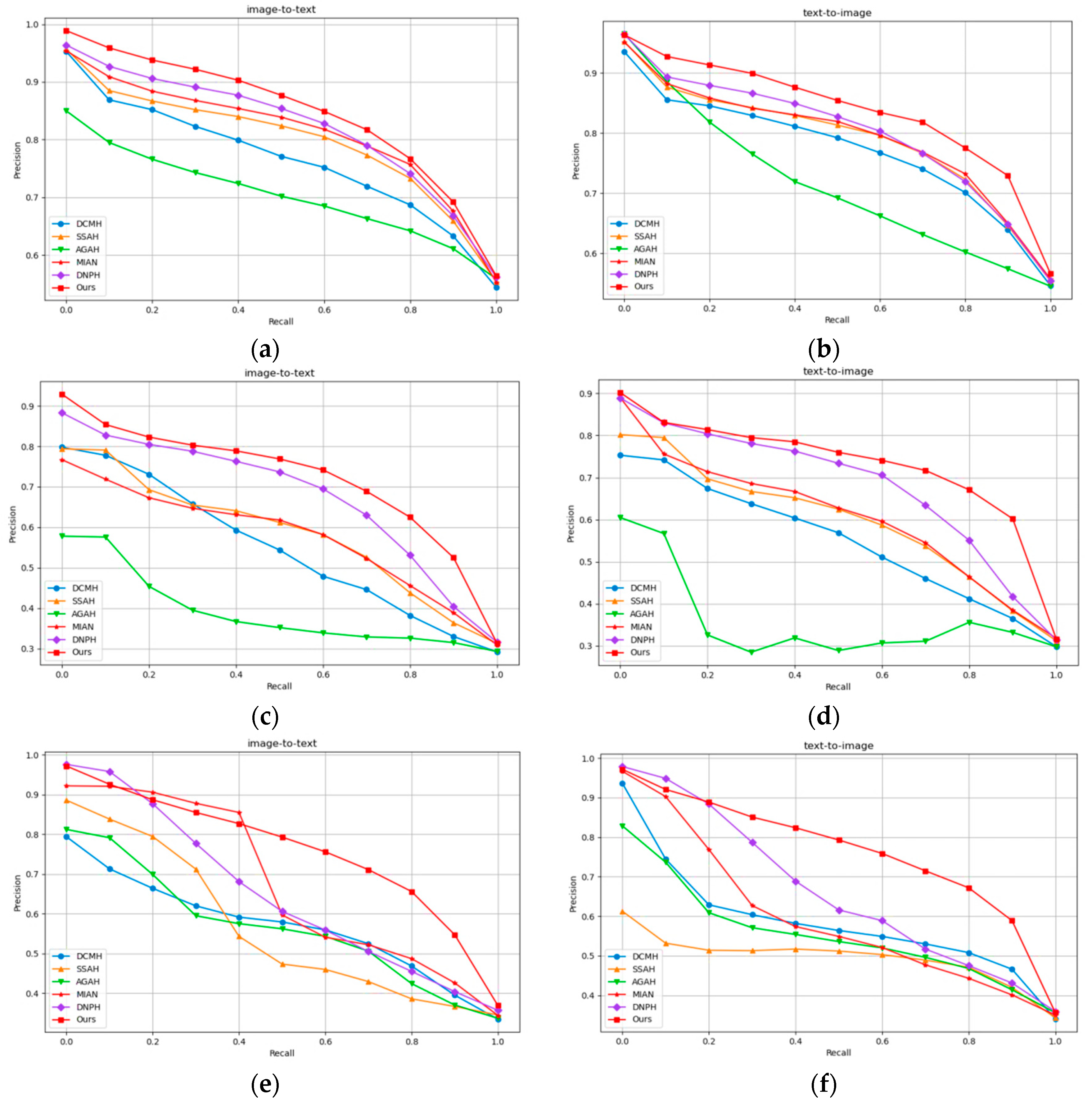 On the MS COCO dataset, FFCPH exhibited slightly lower precision than DNPH and MIAN at low recall rates (Recall < 0.4) in the I→T task but consistently outperformed other methods when Recall > 0.4, with significantly higher precision. In the T→I task, FFCPH showed marginally lower precision than DNPH when Recall < 0.2 but maintained superiority thereafter. These results indicate the high robustness and strong generalization capacity of the FFCPH model.