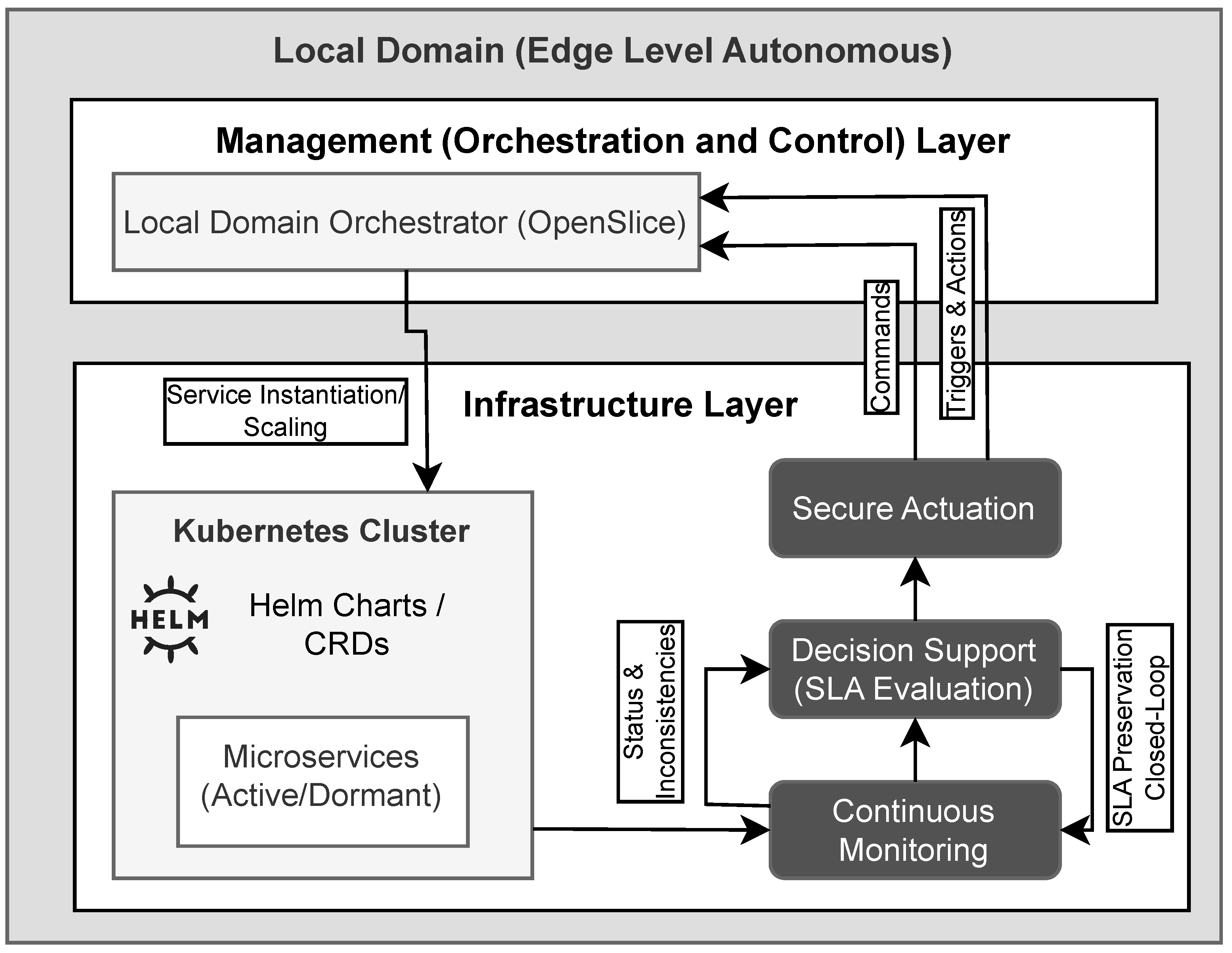 Figure 2 details the Local Domain architecture, illustrating how the Local Domain Orchestrator manages the infrastructure through a closed-loop system of monitoring, decision support, and secure actuation.