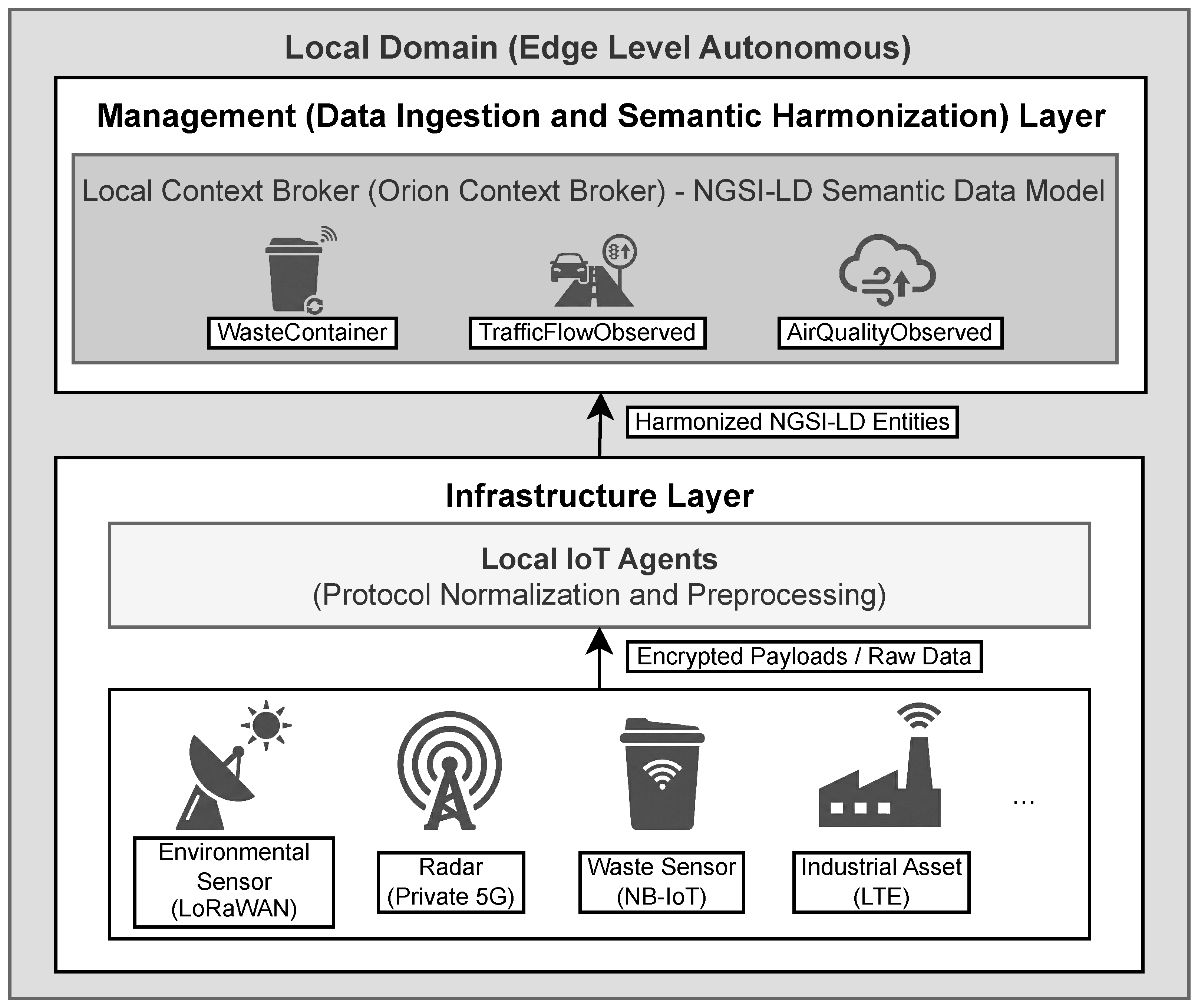 The overall architecture presented in this document is validated within a local domain, which is formed by a multi-site ecosystem that integrates various stakeholders. Each entity functions as a Local Domain with its own infrastructure characteristics and operational constraints. This environment reflects fundamental smart-city requirements: distributed sensing is handled through Local IoT Agents that normalize heterogeneous data sources, including radars, environmental sensors, and industrial equipment, while maintaining compatibility with the semantic data models adopted by the platform. Local autonomy is preserved through the Local Domain Orchestrator, which ensures that essential services remain operational even in the presence of upstream network partitions. This design supports resilient and context-aware service delivery across diverse urban infrastructures.