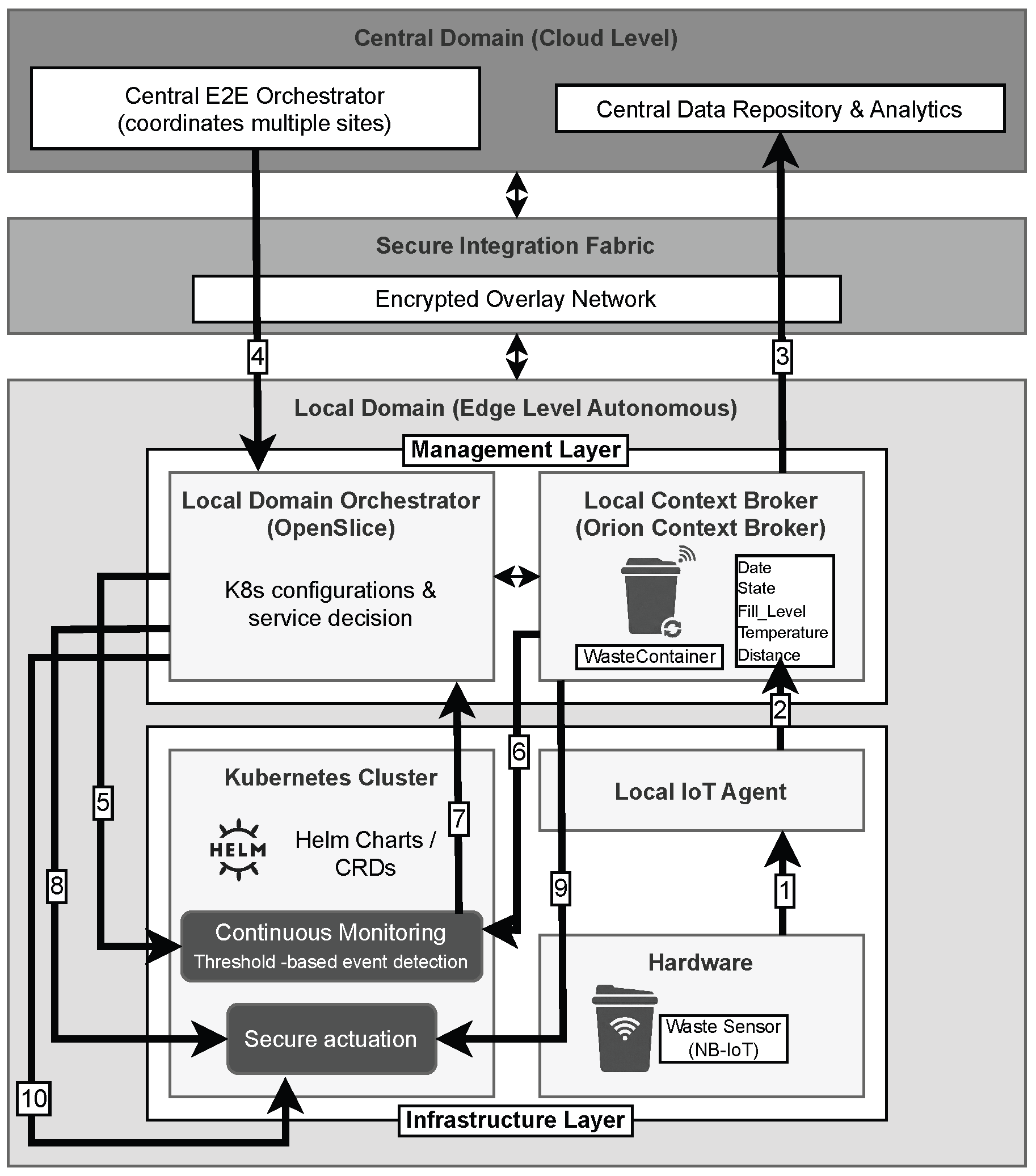 External Notification and Teardown: Finally, the Secure Actuation application transmits an alert to the external waste collection company to schedule an urgent pickup. Once this task is successfully confirmed, the Local Domain Orchestrator automatically undeploys the Actuation service to reclaim edge computational resources, completing the efficiency loop