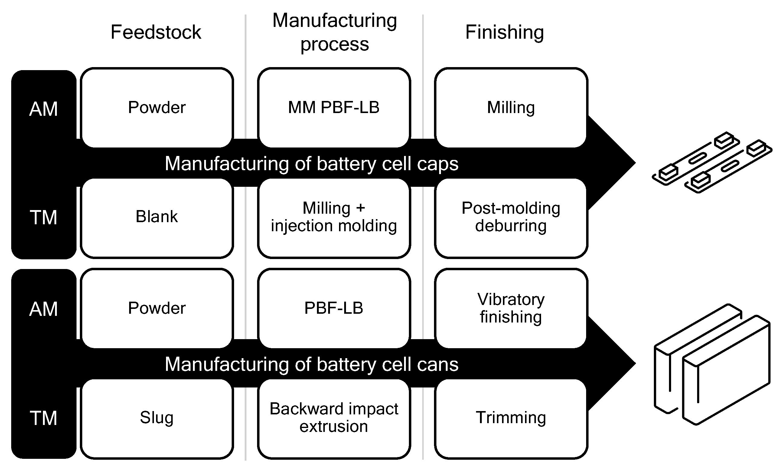 4]. Tool-Based Manufacturing (TM) methods for battery cell housing production require complex tooling, making them especially suitable for high-volume production scenarios with fixed designs [
