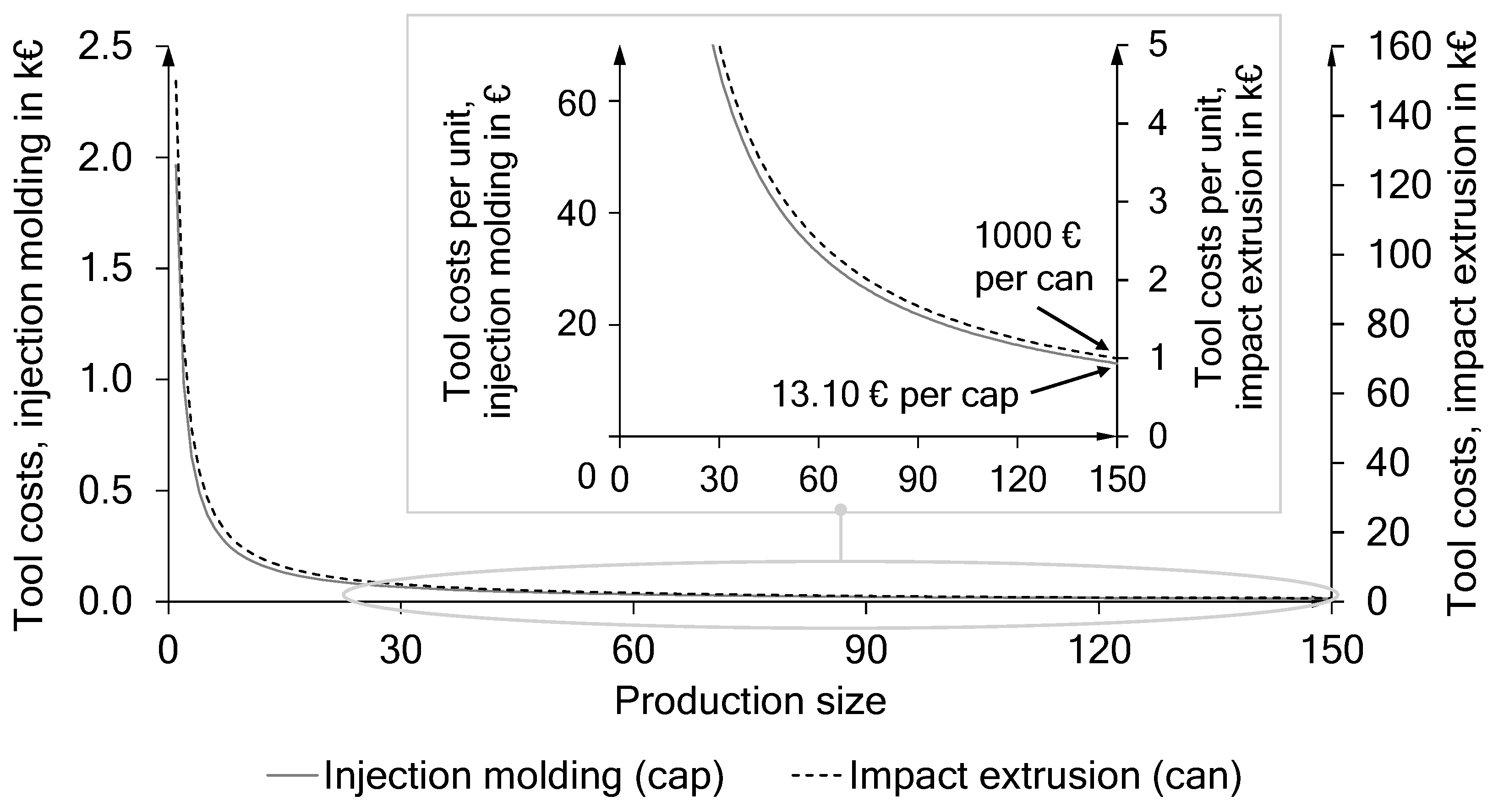 Tooling costs arise from the specific tools required for manufacturing the can and cap parts. This cost category applies exclusively to TM methods, as AM does not require additional tooling for the build-up process (, ). Tooling is necessary for both the backward extrusion process and the injection molding. However, as mentioned before, while no investment in an injection-molding machine is required, the tooling must be explicitly designed and manufactured—even in scenarios where the injection molding is outsourced. The tooling costs are evenly distributed across the total number of produced units, meaning that the cost per unit decreases as production volume increases until the lifetime of the tool is reached.