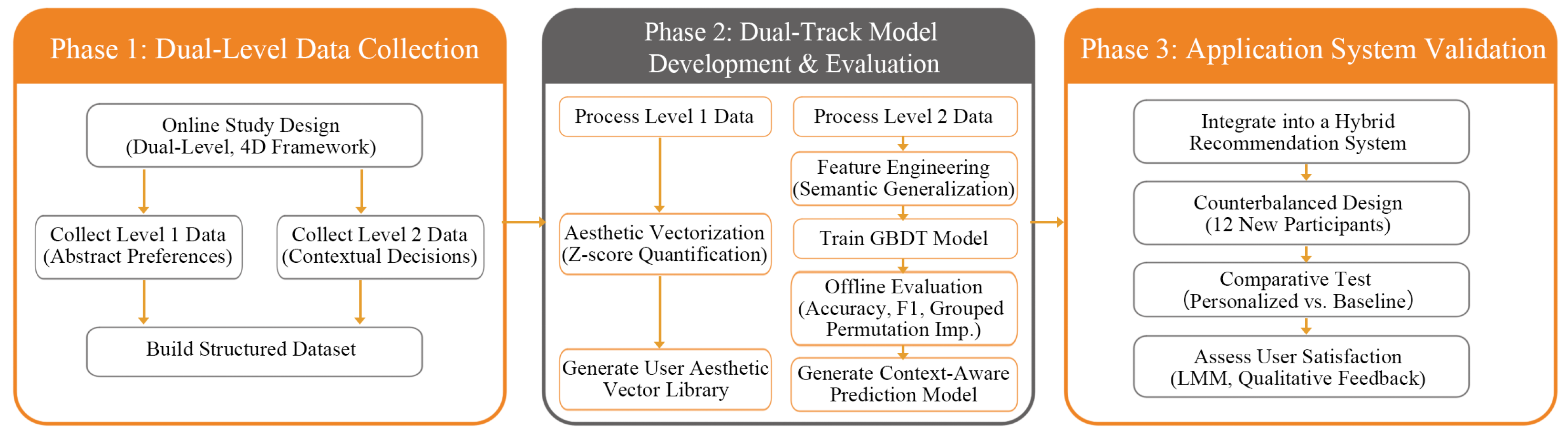 Fifth, our online data collection method introduces the potential for sampling bias. Participants were recruited through online platforms and may have a higher-than-average interest in design and aesthetics, leading to a self-selection bias. This could potentially influence the generalizability of the systematic preference patterns identified in response to RQ1. For example, the strong population-level preference for styles like “Bright” and “Gentle” might be more pronounced in this demographic than in the general population. However, it is important to note that the primary goal of this study was not to establish universal aesthetic laws, but rather to develop and validate a computational framework for capturing, quantifying, and modeling individual aesthetic preferences. The core findings—such as the dominance of context over demographics (RQ3) and the model’s ability to generate diverse, satisfying recommendations (RQ2)—are predicated on the internal consistency and structure of the collected data, rather than its absolute population-level representativeness. Future work could address this limitation by recruiting a more stratified sample from diverse demographic and psychographic backgrounds to further test the cross-population validity of the observed preference patterns.