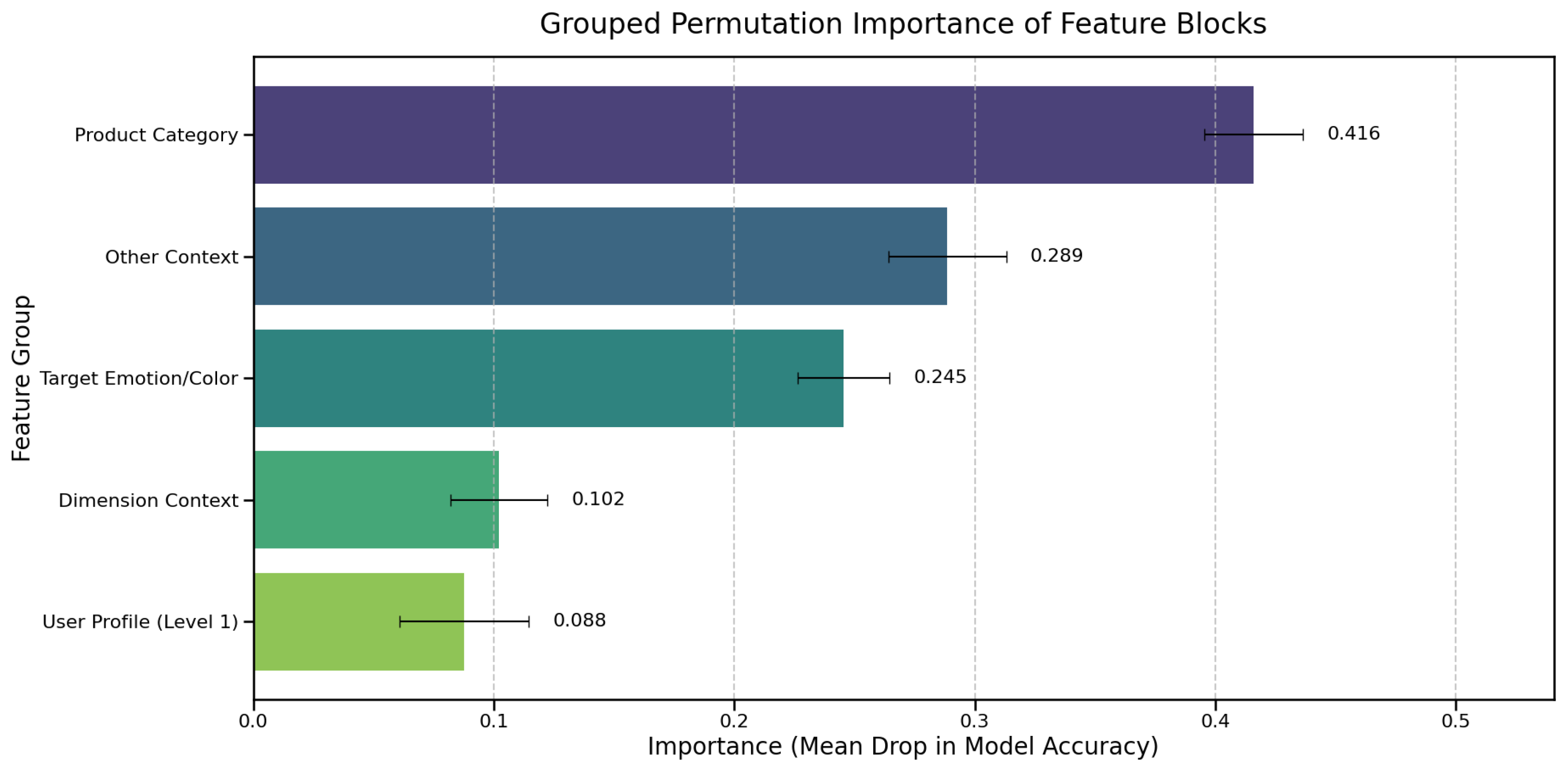 Second, we proposed a “semantic generalization” approach for feature engineering that may help address the cold-start problem in recommendation systems. Instead of treating each product as a unique instance, which limits scalability, we mapped specific products to generalized categories (e.g., “Personal Consumer Electronics”). Our grouped permutation importance analysis revealed that product_category was the single most dominant predictor (Importance = 0.416). This is a crucial finding: it provides evidence that context is paramount and offers a scalable method for applying the model to new, unseen products, suggesting a potential cold-start solution for recommendation systems in the design domain.