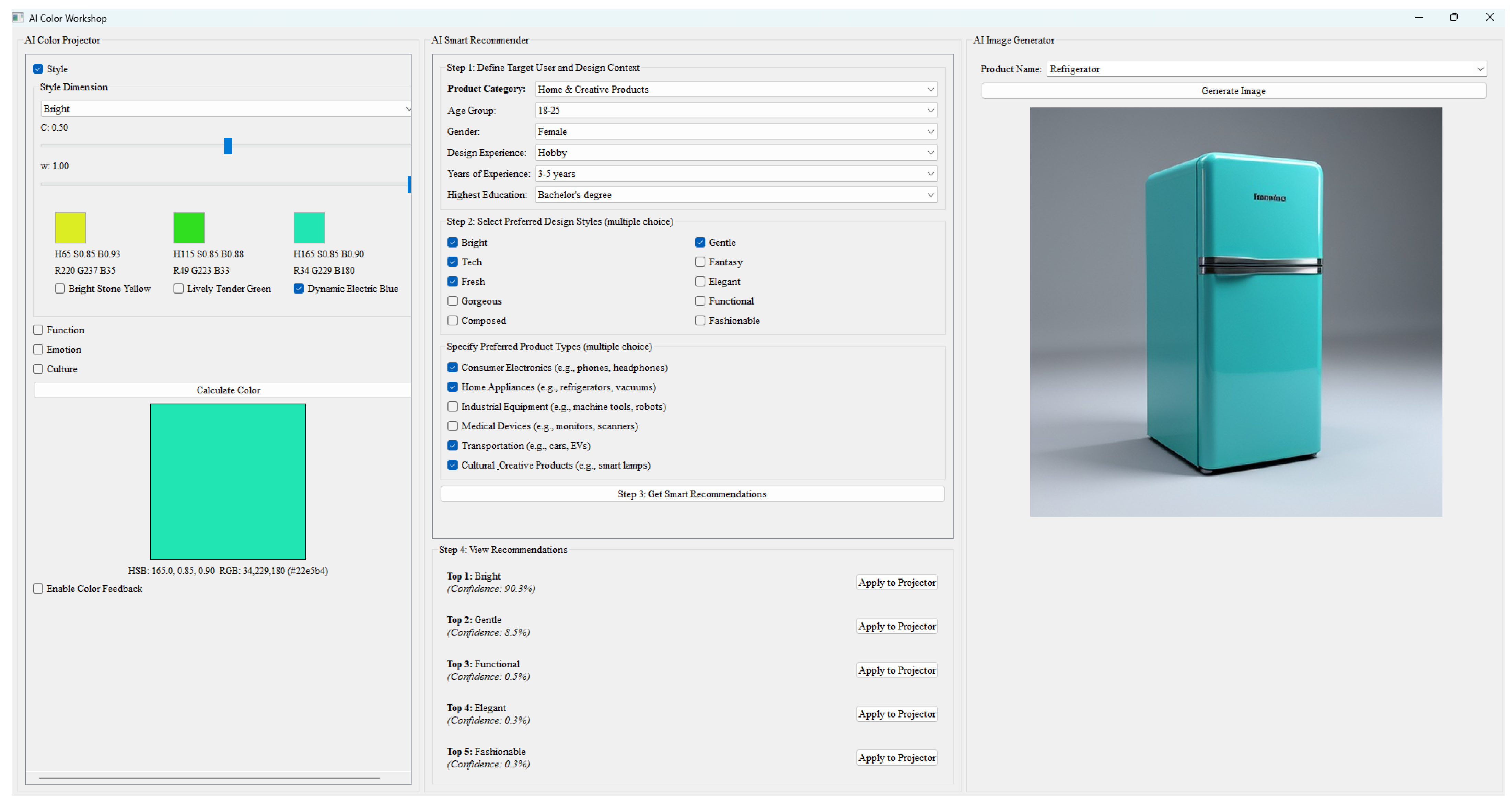 Figure 7, the application integrates three modules. The “AI Color Projector” (left) for semantic-to-color mapping and the “AI Image Generator” (right) for final rendering were developed in our foundational study. They provide the core engine for translating any given semantic into a precise color and applying it to a generated image. The novel contribution of the current research is the central “AI Smart Recommender” module. This new component embeds our trained preference model, acting as an intelligent bridge that personalizes the entire workflow.