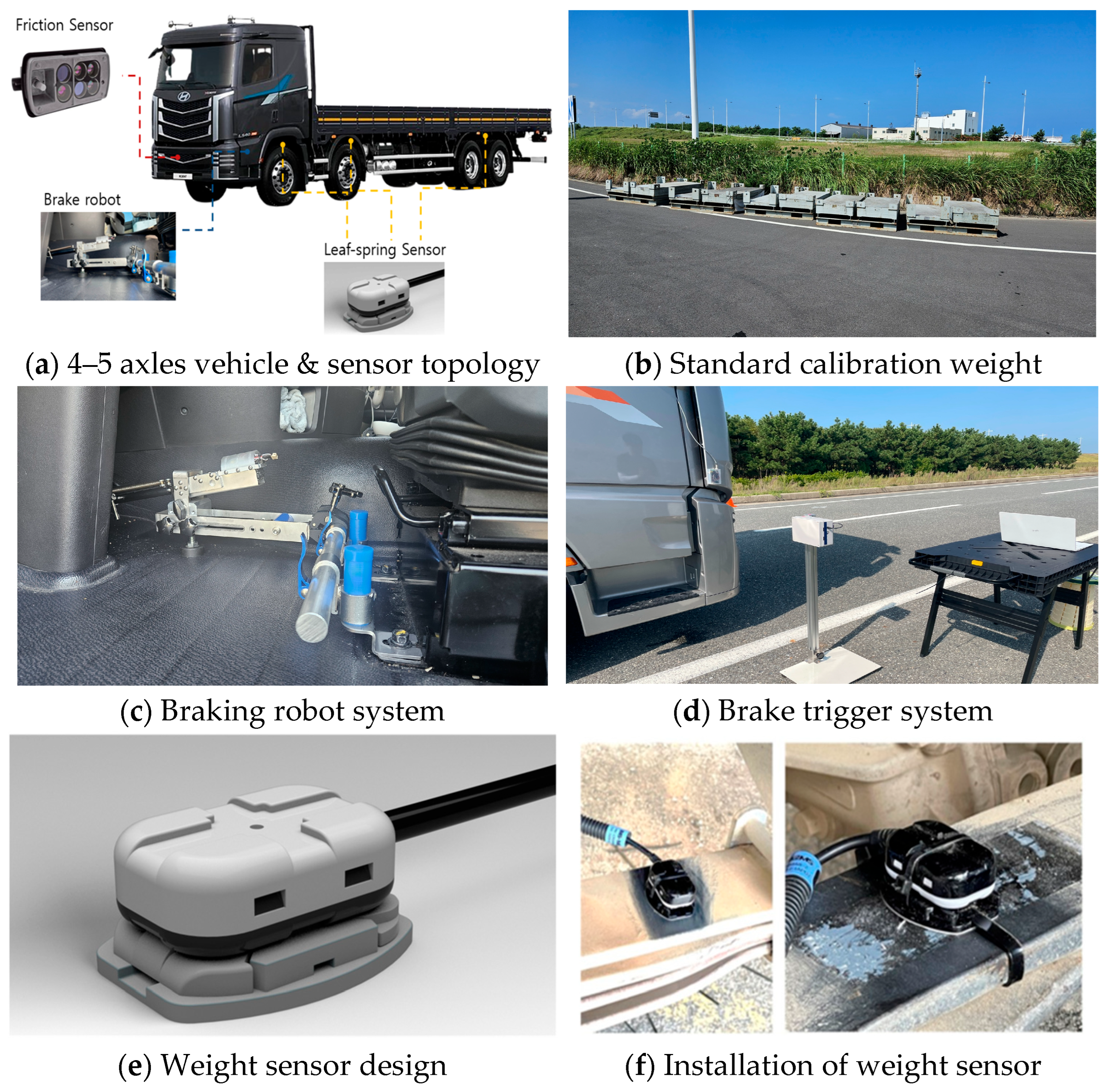 Accordingly, a clear research gap exists: the absence of an experimentally validated, end-to-end framework that (i) captures braking-time axle-load dynamics in real time on a multi-axle truck and (ii) leverages these dynamic variables—together with friction-relevant information—to improve braking-distance prediction across varying payload and road conditions.
