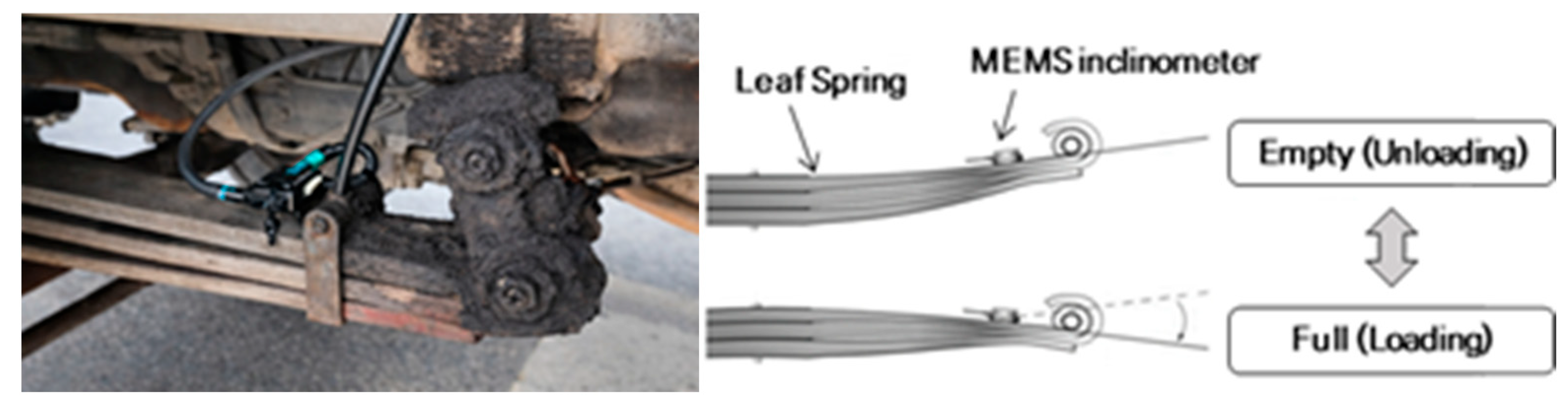 Figure 2 illustrates the geometric configuration of the proposed sensing module. A compact MEMS inclinometer is attached to the top leaf near the spring eye, where vertical load induces the greatest rotational displacement. As the vehicle load increases, the leaf-spring stack deflects downward, generating a measurable angular change