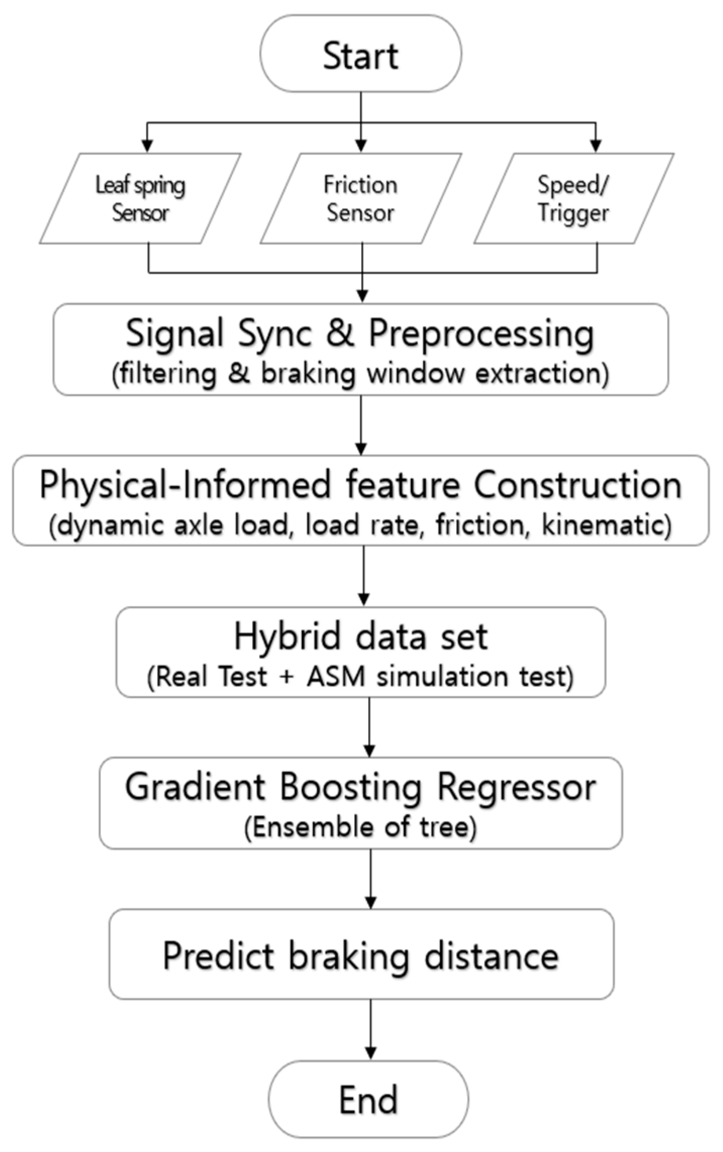 a unified data-fusion and modeling structure that synchronizes load, friction, and deceleration measurements for subsequent braking-distance modeling.