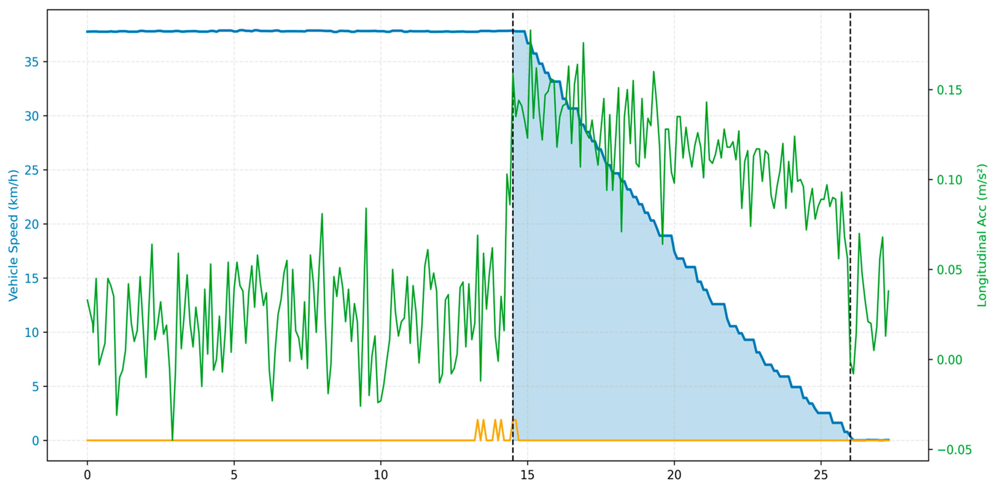 Time-series profiles of vehicle speed, trigger signal, and longitudinal acceleration during a full-scale braking event. The brake onset is identified at the last rising transition of the trigger signal from 0 V to 5 V, which marks the activation of the robotic braking actuator. The brake termination is determined when vehicle speed drops below 0.5 km/h, indicating a complete stop. The shaded interval represents the effective braking phase. Vehicle speed decreases monotonically after brake onset, while the longitudinal acceleration exhibits transient oscillations caused by dynamic load transfer, suspension compliance, and tire–road interaction. These synchronized signals provide the basis for extracting braking distance and analyzing dynamic axle-load variations during real-vehicle braking.