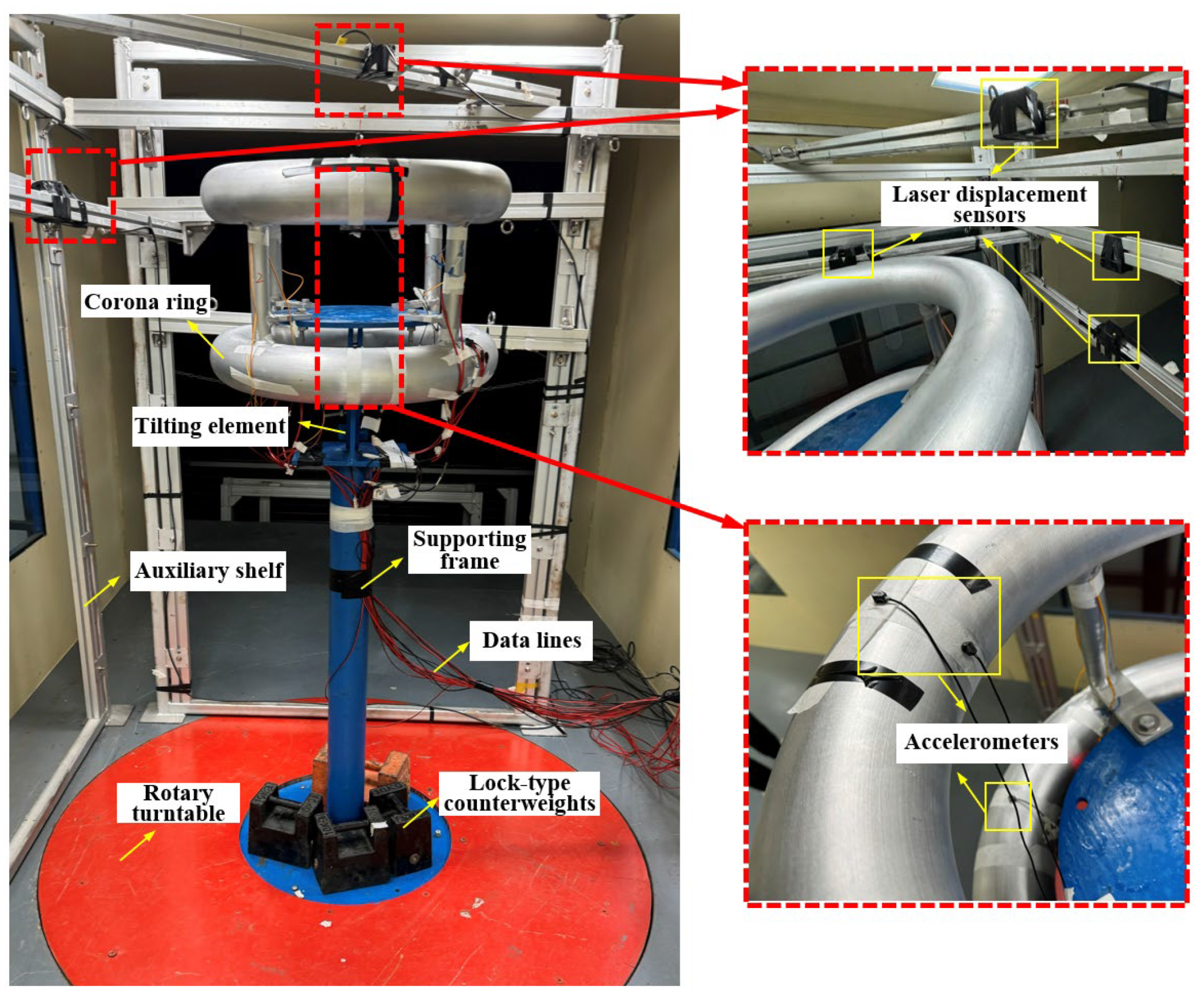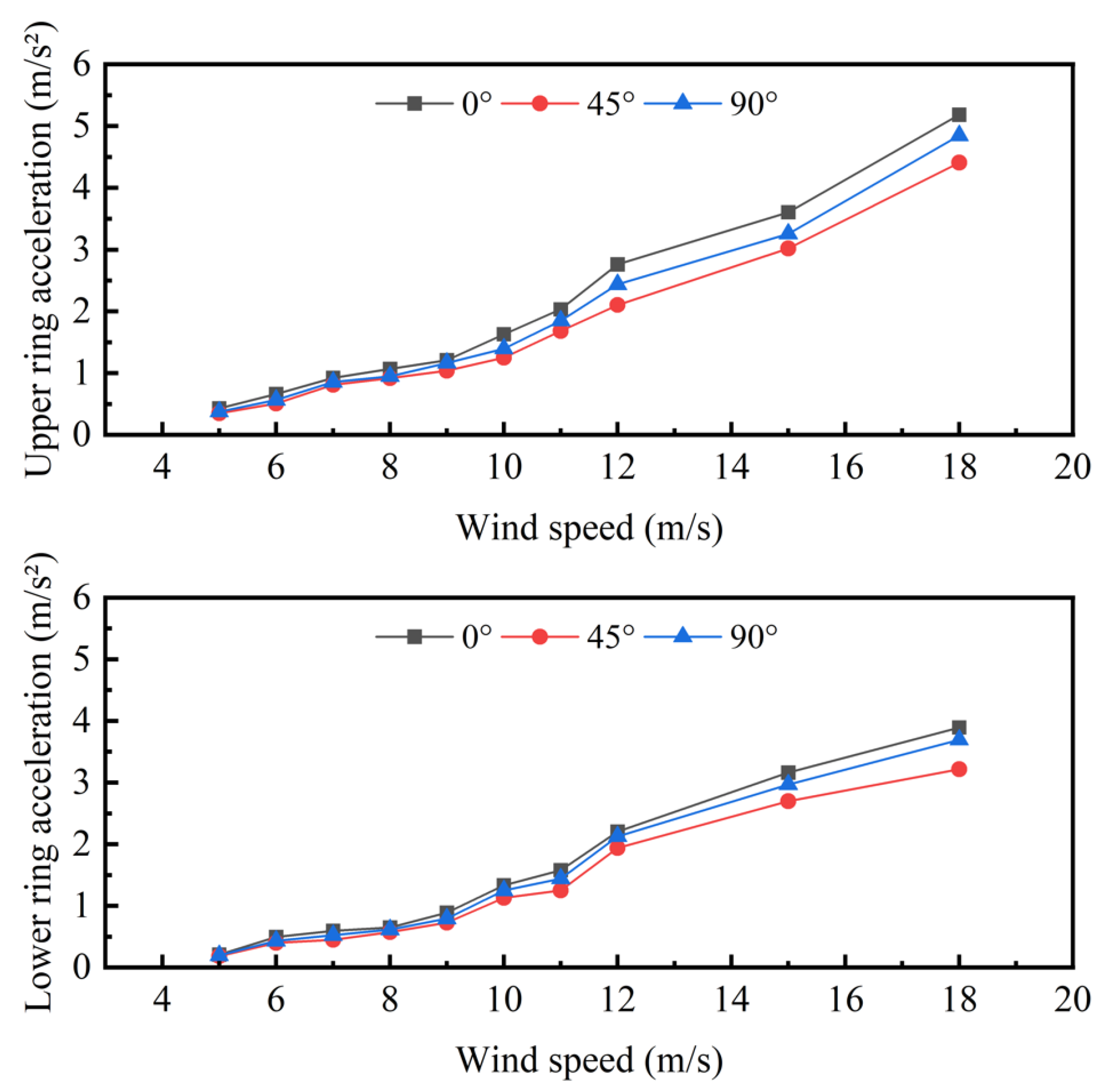 - Wind tunnel tests indicate that the peak acceleration of the corona ring is positively correlated with wind speed, with the magnitude ranking as 0° > 90° > 45° across wind angles. Peak displacement follows an increase–decrease–increase trend, and vortex-induced vibration is prone to occur within the 5–8 m/s range.