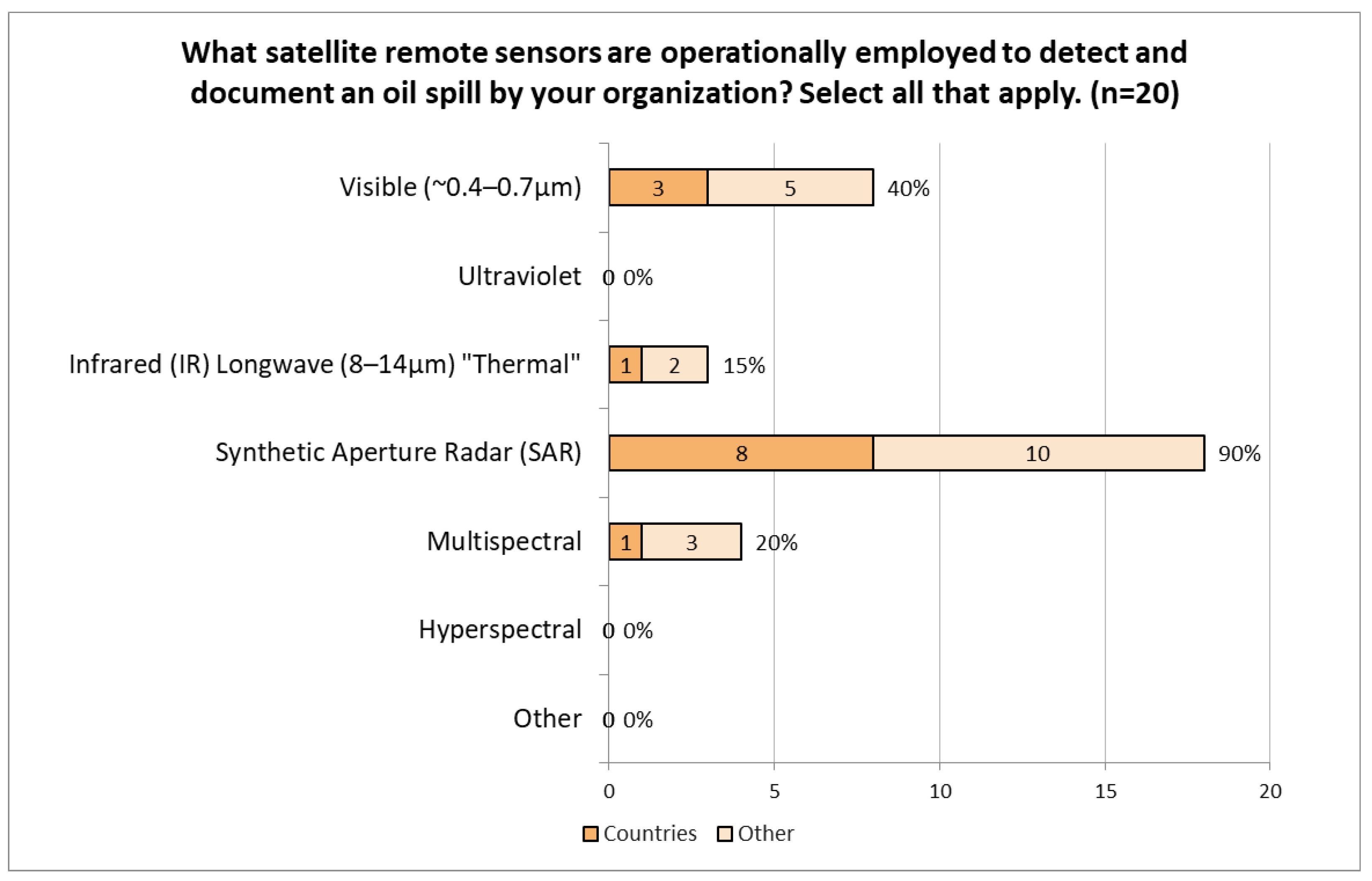 Of the 24 survey respondents to this section, 20 reported using satellites for oil spill surveillance (84%). Of those, ten (50%) were country representatives and ten (50%) were other spill response organizations. The primary remote sensor respondents use from satellites to support oil spill response is synthetic aperture radar (SAR) (90%), followed by sensors in the visible spectrum (40%), longwave IR (15%) and multispectral (20%) (