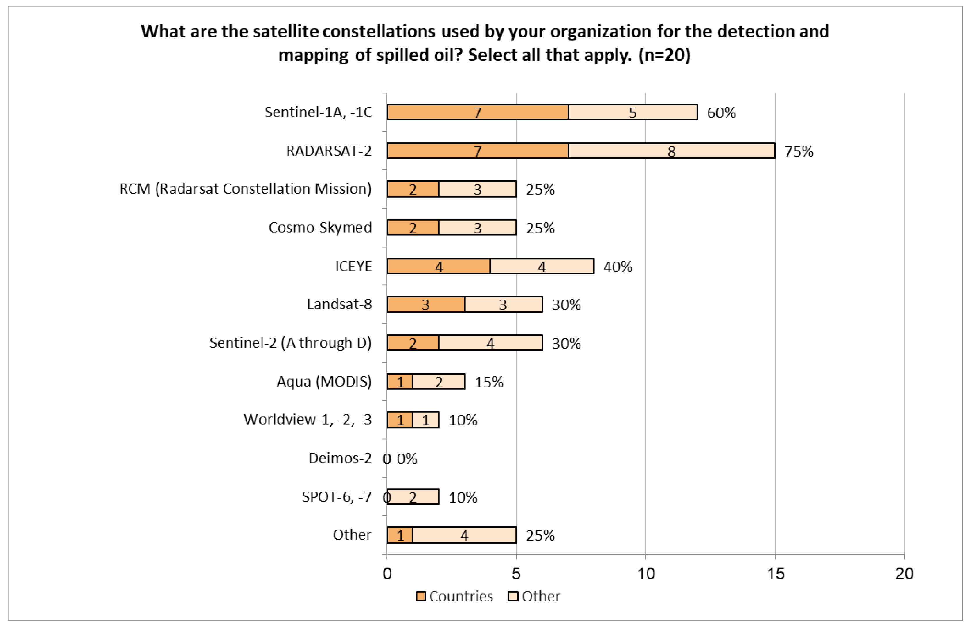 Responses to the global survey were compiled into summaries grouped by platform type (i.e., satellites, aircraft, helicopters, remotely piloted aircraft systems) as well as those about shoreline surveillance. All responses to the multi-select questions were plotted on horizontal bar graphs grouping responses from “countries” and “other” organizations. Some bar graphs are included in the results as figures, but most of the questions were summarized in text with a percent total of respondents per answer written beside the answer (e.g., hyperspectral (20%)). Where a distinction is made between respondents from “countries” and “other” response organizations, it is indicated by counts of respondents out of the subset of responses (i.e., 3 of 5).