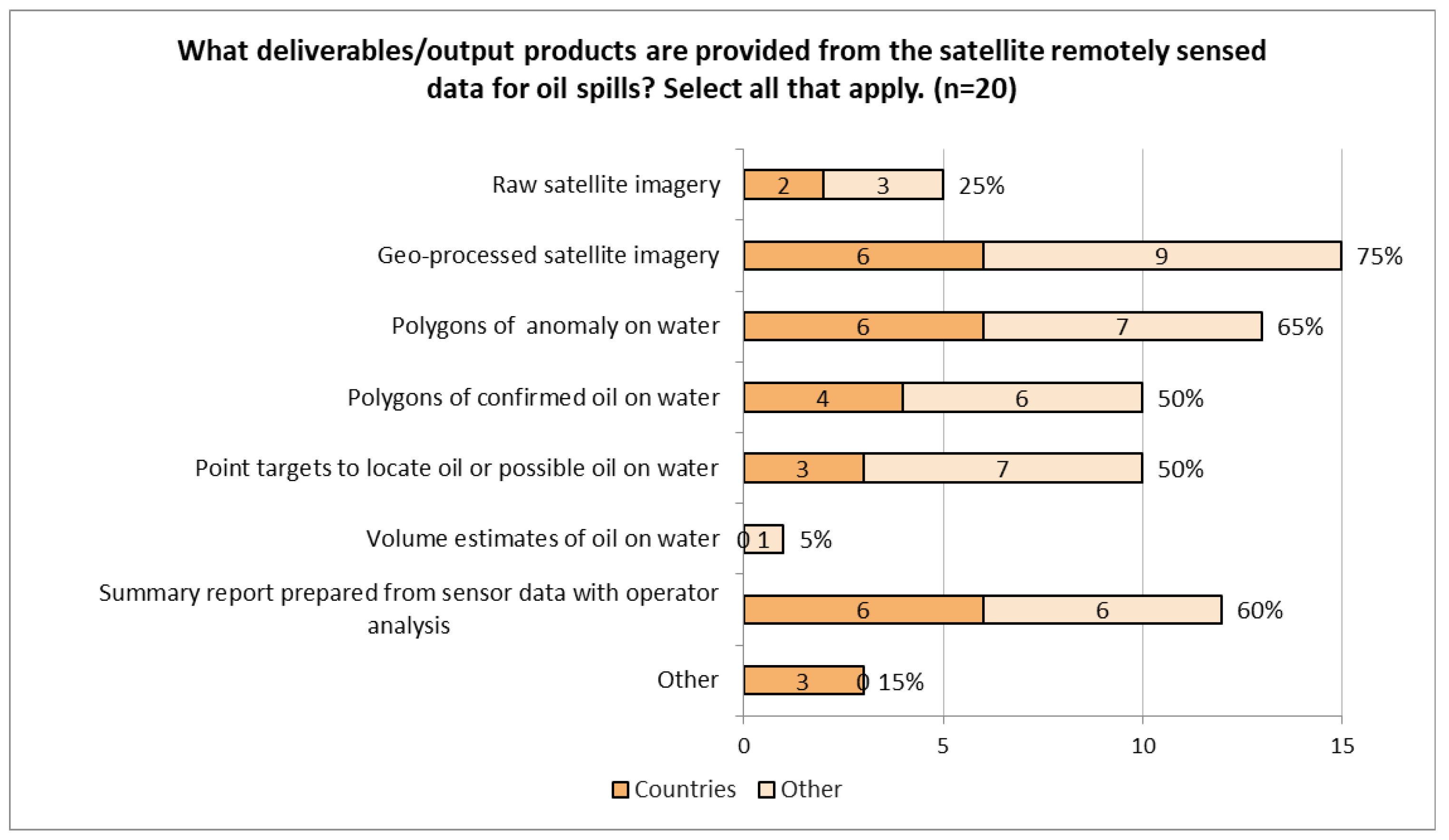 Figure 3). Three “Other” deliverables not listed are GIS files such as shapefiles and geojsons, “Alert reports”, and statements that “any anomaly (i.e., ice floes, possible oil, or other) is investigated and correlated with known traffic patterns or reported movements.” With regards to automation employed to process satellite data, no groups responded as using “Fully Automated” spill detection/delineation and classification. All responded with predominantly “Semi-Automatic—Operator Supported” (65%) or “Fully Manual—Operator Conducted” detection and data classification (30%). One group responded “EMSA CleanSeaNet service” as an “Other” response.