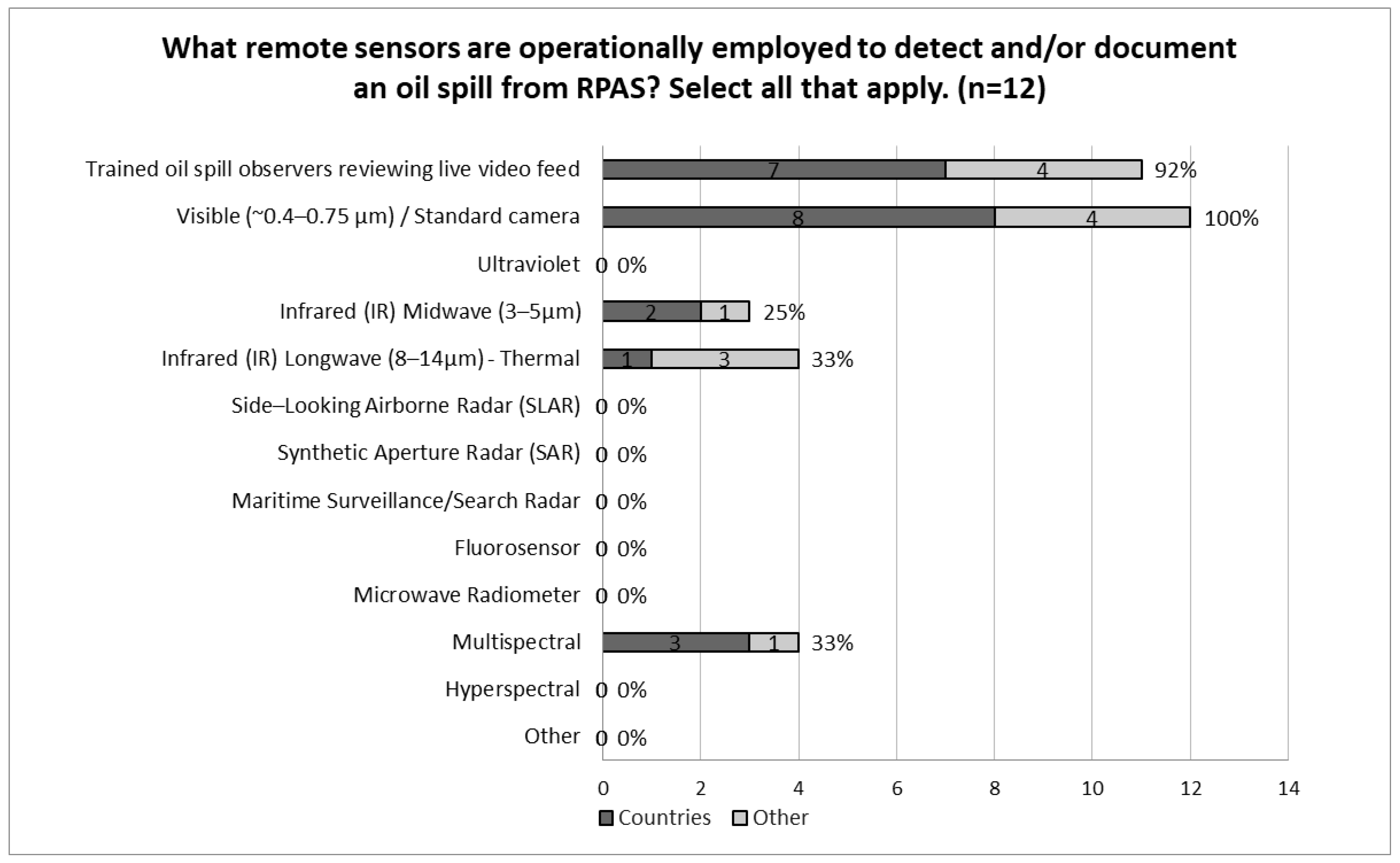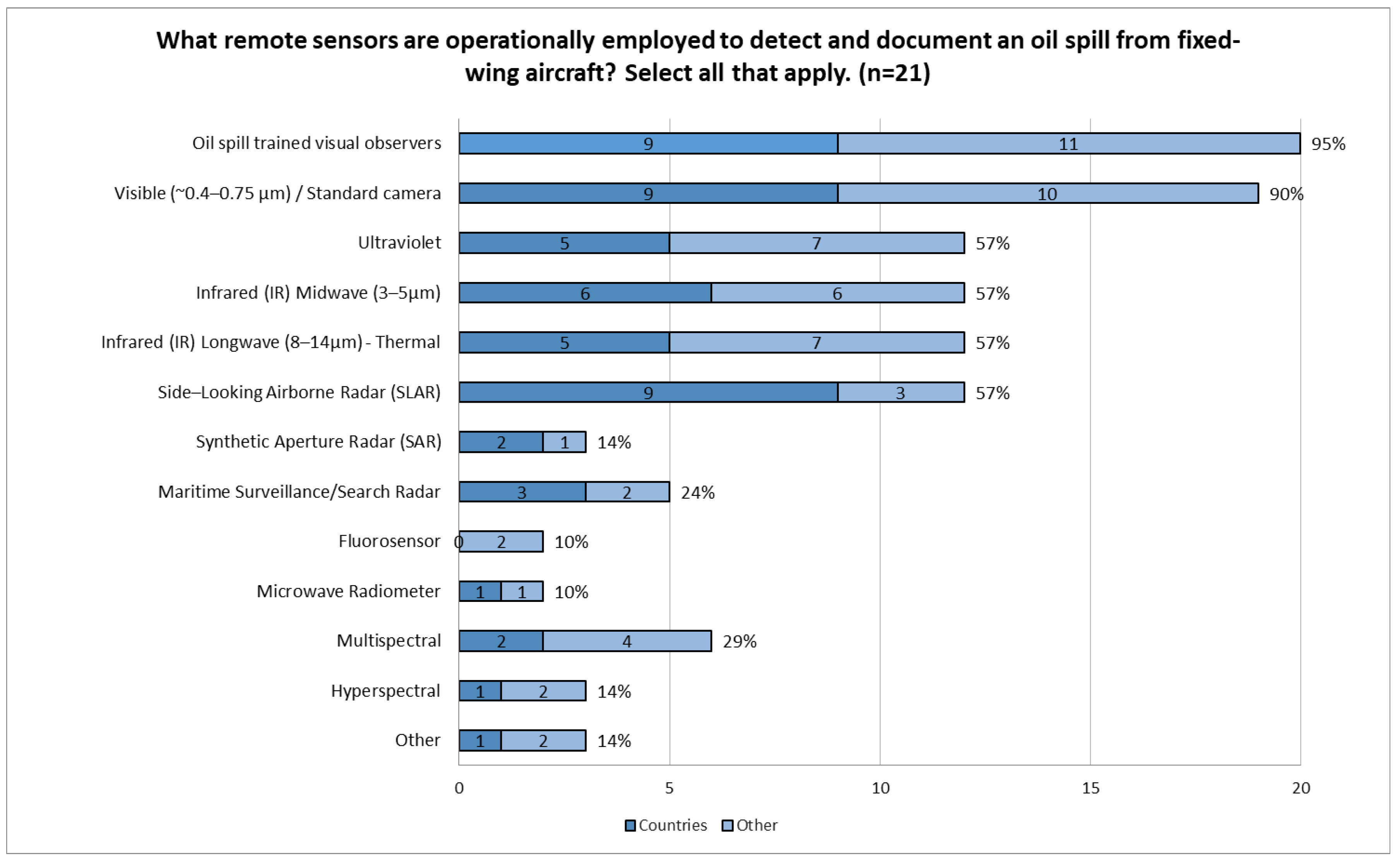 Figure 4). Respondents also employ ultraviolet (UV) (57%), midwave infrared (MWIR) (57%) and longwave infrared (LWIR) (57%). For oil spill surveillance conducted with radar systems, side-looking airborne radar (SLAR) (57%) was the largest proportion of respondents, followed by maritime search radar (24%) and SAR (14%). Additional sensors used by fewer respondents include: multispectral (29%), hyperspectral (14%), radiometer (10%) and fluorosensor (10%), although notes to this question provide further insight that radiometer and fluorosensor were removed from aircraft and one respondent stated that multi- and hyperspectral sensors are tested but not currently installed on board the aircraft. Also of note, multispectral and hyperspectral sensors are used more by other response organizations than countries.