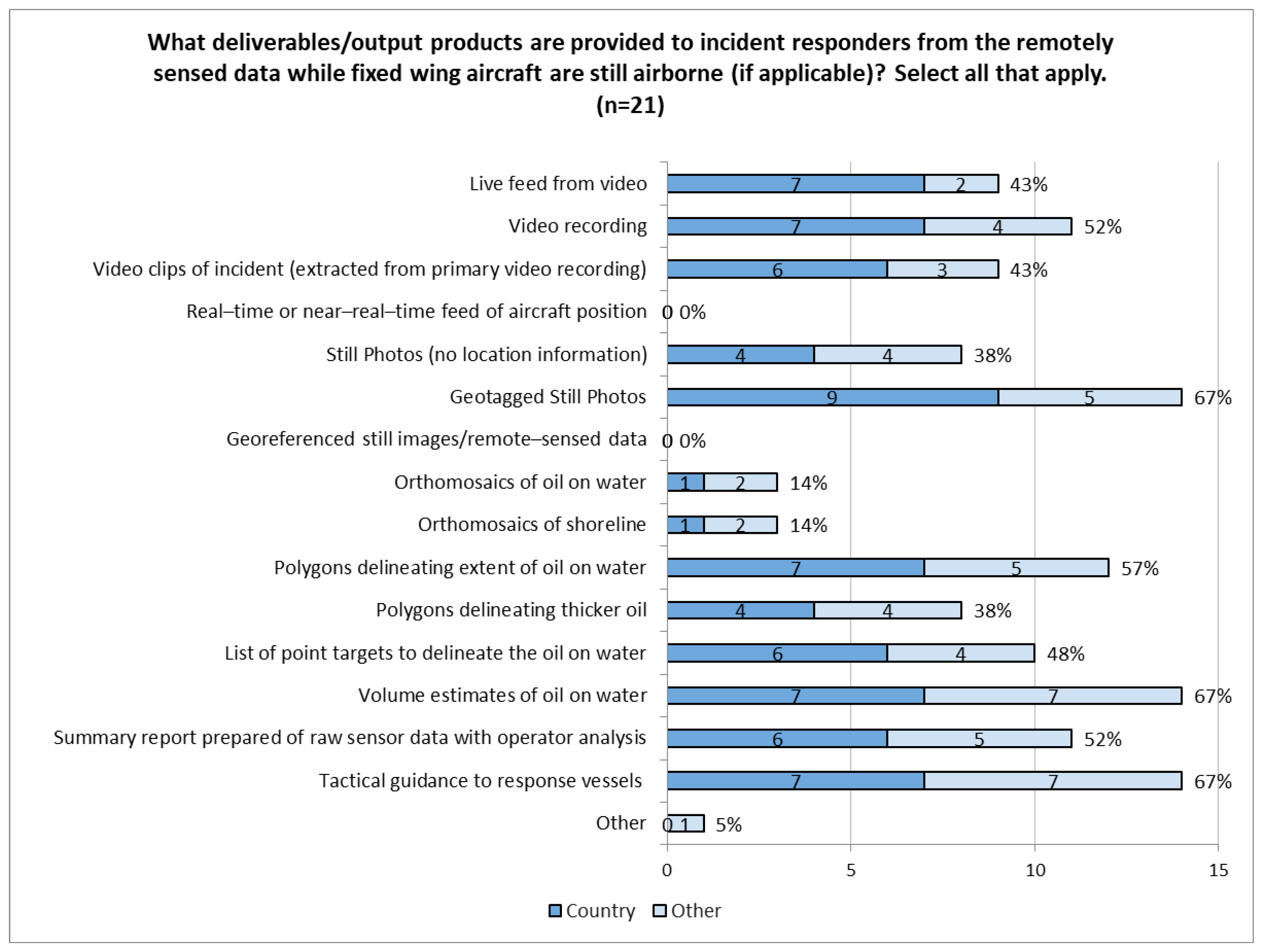 The predominant deliverables/output products provided from fixed-wing aircraft while the plane is still airborne include: “Geotagged still photos” (67%), “Georeferenced remote sensed imagery” (57%), “Polygons delineating extent of oil on water” (57%), “Volume estimates of oil on water” (67%), as well as “Tactical guidance to response vessels” (67%) (