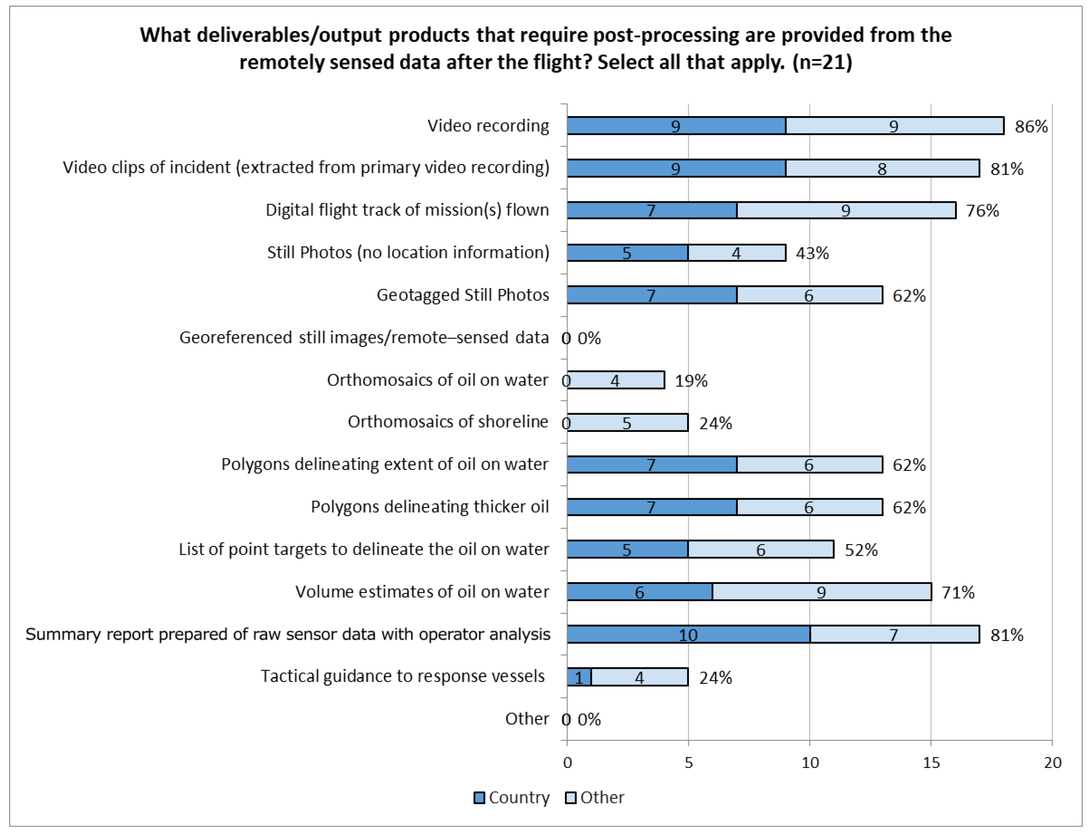 Figure 5). Deliverables/Output products provided by fixed-wing aircraft post-flight include: “Video recordings” (86%) and “Video clips of incidents (extracted from primary video recordings)” (81%), “Summary reports prepared from raw sensor data with operator analysis” (81%), “Digital flight track of the mission(s) flown” (76%), “Volume estimates of oil on water” (71%), and “Georeferenced remote–sensed data” (67%) (